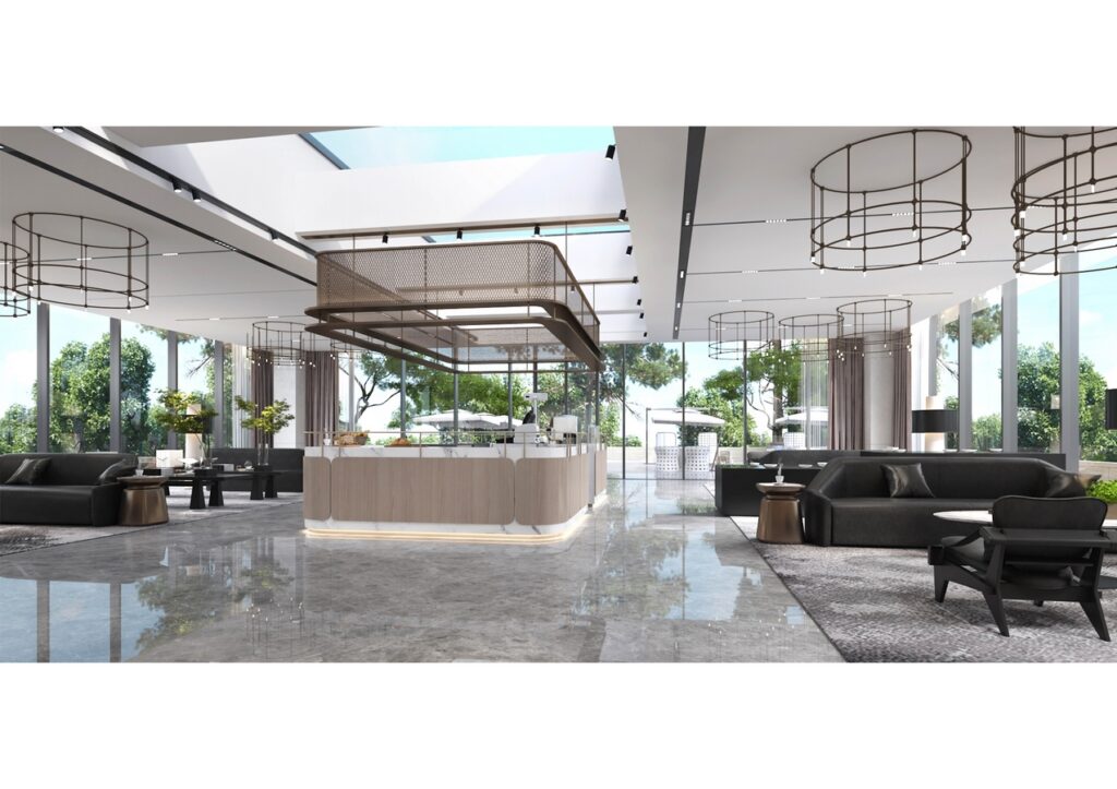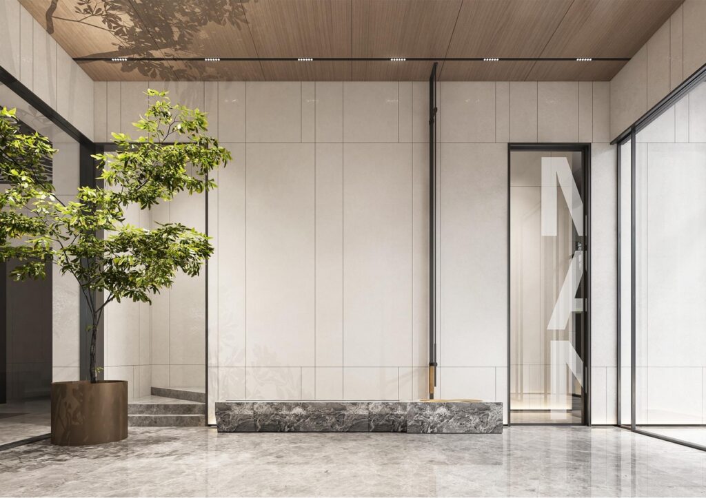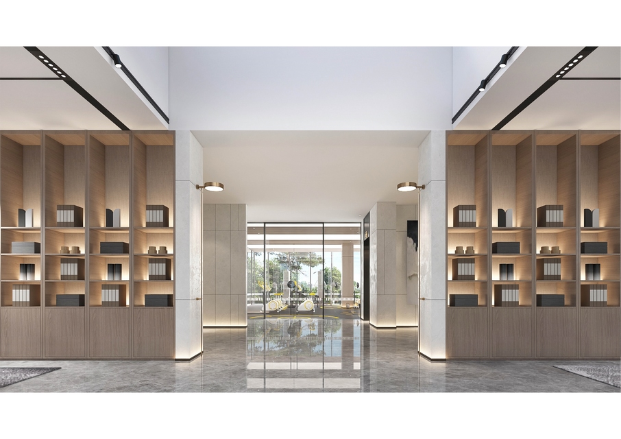 The reception area is mainly made of glass, stone, and wood veneer, with the modern sense of interspersed blocks and the sense of symmetrical sequence in the central axis, together with the light and luxurious texture of metal materials and the permeability of glass materials, creating the ultimate visual sense of dignity. Under the auspices of simple and elegant artistic design, the transparent and elegant texture stands out.