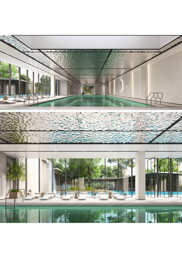 Throughout the entire pool space, the open and transparent, the top surface of water-stable glass material, under the visual effect of light and shadow, the water and sky, a pool of “spring water” with the flowing softness and the strong sense of space, and the floor-to-ceiling windows outside the scenery, the blue water, and clouds of the sky imagery called out.