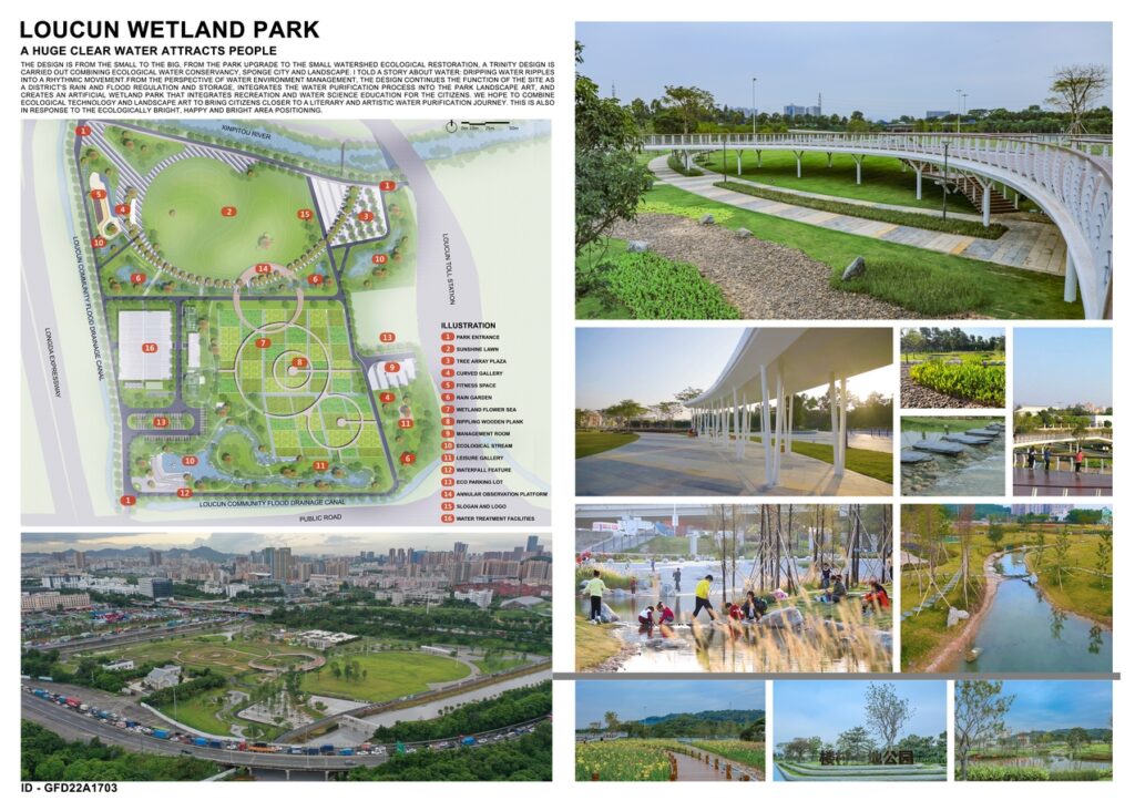 From the perspective of water environment management, the design continues the function of the site as a district’s rain and flood regulation and storage, integrates the water purification process into the park landscape art, and creates an artificial wetland park that integrates recreation and water science education for the citizens. We hope to combine ecological technology and landscape art to bring citizens closer to a literary and artistic water purification journey. This is also in response to the ecologically bright, happy and bright area positioning.