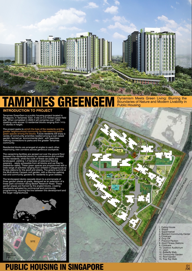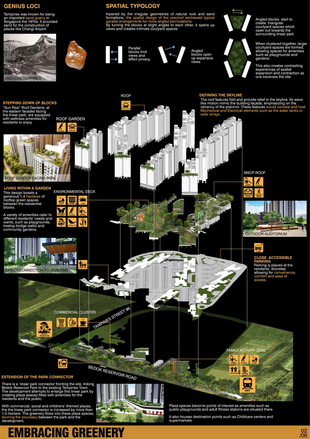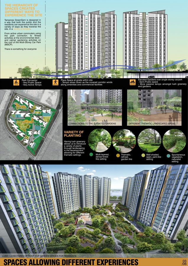 The site is located in Singapore in the residential township of Tampines. The area of the development is approximately 5.09 hectares and is bounded by Bedok Reservoir Road and Tampines Street 96 to the east and west of the site respectively. A linear park connector running along the length of the development fronting Bedok Reservoir Road, connects the existing Tampines Town to the 88- hectare public park, Bedok Reservoir Park. This linear park connector is expected to be a bustling pedestrian axis. The initial thought in design of the project was to leverage on this linear park connector to create pockets of spaces within the Tampines GreenGem project, blurring the boundary between the park connector and the development. The result increased the linear park by one hectare. Apart from greenery, commercial and family life facilities were added in these pockets of spaces to make them points of interest bring “life” into these spaces.
