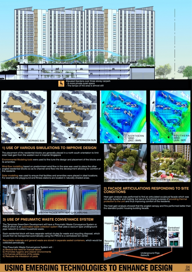 The residential blocks were generally orientated in a north-south orientation to limit solar heat gain from the western tropical sun. The blocks were then angled away from one another to create the spaces for the greenery among the block and open up the views for the future residents. Emerging technologies were used to improve the design of the development such as wind flow modelling which resulted in the shifting of some of the blocks in design stage to allow for better wind flow. Solar modelling was used to ensure that facilities and amenities were placed in ideal locations. For example the playgrounds and fitness stations are located to take advantage of the shade cast by the buildings in the afternoons and evenings.