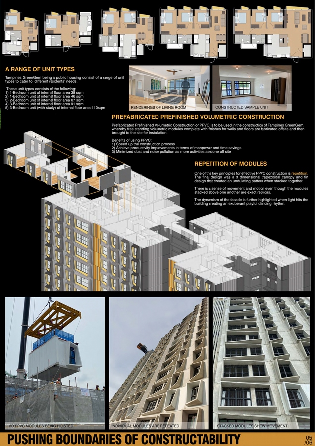 Prefabricated Prefinished Volumetric Construction or PPVC is utilized in the construction of the residential blocks whereby 3 dimensional modules are fabricated off-site and then brought to site for installation. This construction method speeds up the construction process, achieves productivity improvements in terms of manpower and time savings, and minimizes dust and noise pollution as more activities are done off-site.