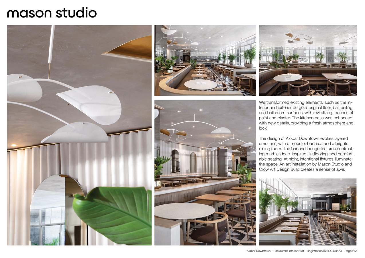 In the bar and lounge, stunning black and white marble contrasts with dark millwork. High-impact flooring in a deco-inspired tile was preserved from the previous tenant. Comfortable seating is lined against the east-facing wall to provide a variety of options for guests, with enough space for hosts. At night, intentional fixtures illuminate the restaurant. An art installation of suspended mobiles was designed by Mason Studio and fabricated by Crow Art Design Build to inspire a sense of awe from every perspective of the restaurant. The main gesture of reduction was using existing elements of the space, rather than removing. The interior and exterior pergola was retrieved from original fabricator that originally installed it, to repurpose in other projects. The original floor, bar, ceiling, and bathroom surfaces were retained. Paint and gentle plaster textures revitalized these elements. The kitchen pass was maintained – details were added on top of the existing frame and texture to provide a different atmosphere and look.