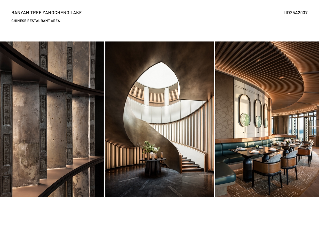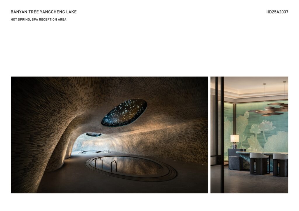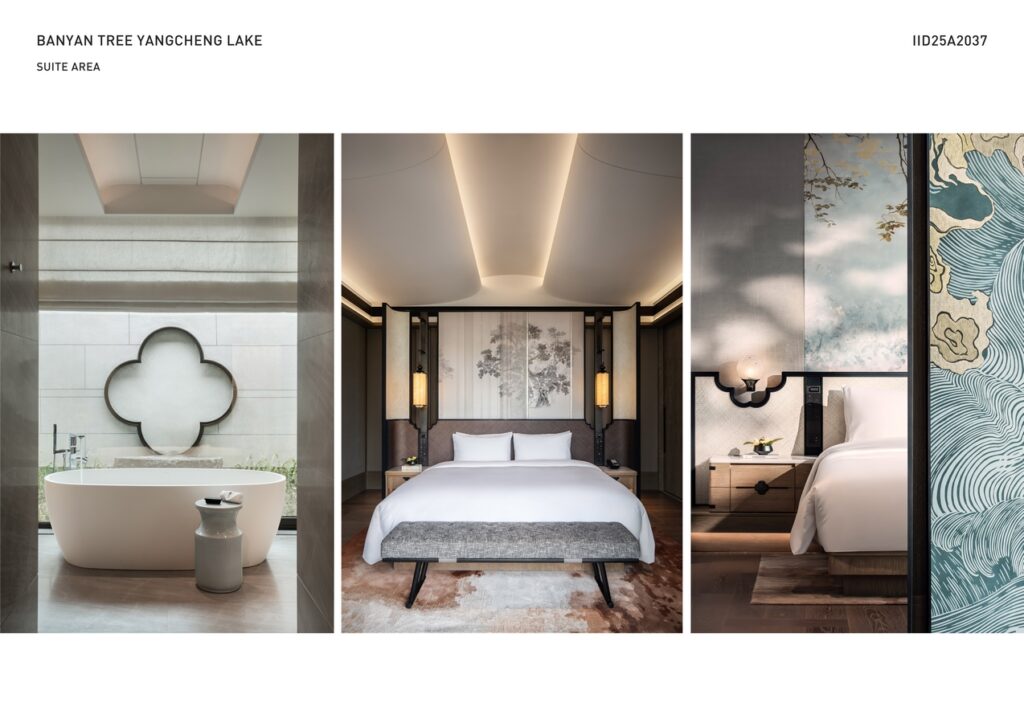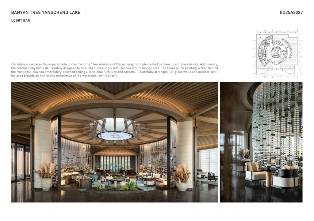 The ceiling of All-Day Dining is designed in a wave-like shape resembling a sailboat, creating a visual focal point. Various bamboo fishing boats and baskets add a touch of lakeside charm. The Chinese restaurant sparkles with precious K’o-ssu silk embroideries as art pieces, enhancing the dining experience. The spa’s soaking pools, inspired by the kilns that produced the imperial bricks, offer a captivating cave-like thermal experience, inviting guests into a world of tranquility. Guestrooms integrate cultural tributes such as pearl-inspired lamps, violin bow-shaped door handles, and lake-textured screens, honoring local heritage and ecology while creating an immersive retreat.