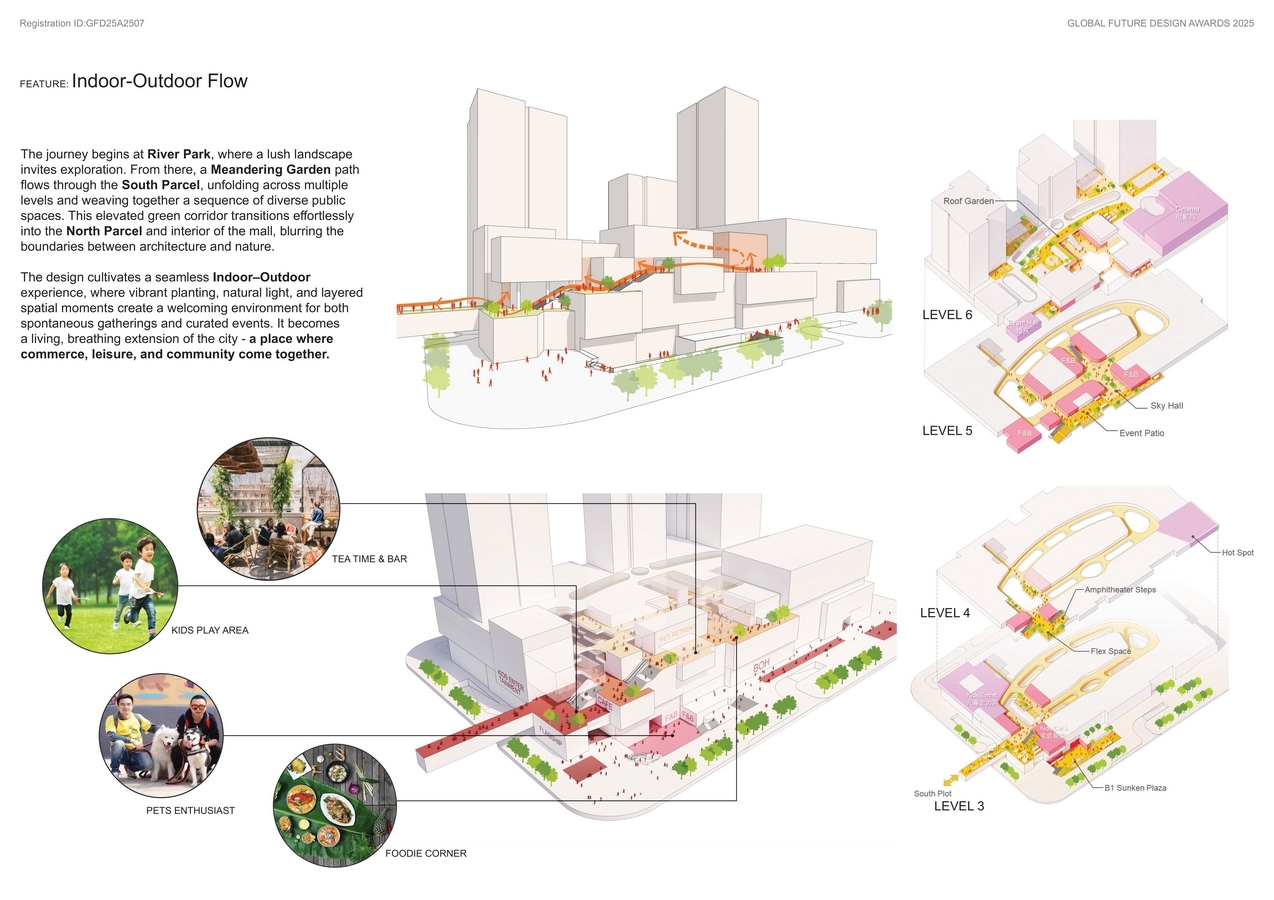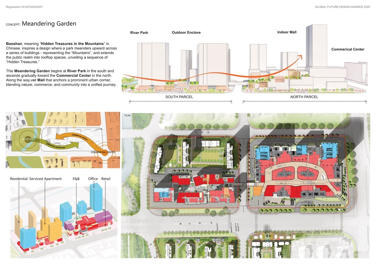 This meandering garden begins at River Park in the south and ascends gradually toward the Commercial Center in the north. Along the way, the garden transitions through a variety of experiences: starting as an outdoor retail enclave adjacent to the park, it gradually evolves into an indoor center that anchors a prominent urban corner, blending nature, commerce, and community into a unified journey.