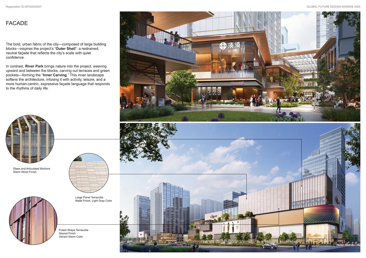 The bold, urban fabric of the city—composed of large building blocks—inspires the project’s outer shell, a restrained, neutral façade that reflects the city’s scale with quiet confidence. In contrast, River Park brings nature into the project, weaving upward and between the blocks, carving out terraces and green pockets—forming the Inner Carving. This inner landscape softens the architecture, infusing it with activity, leisure, and a more human-centric, expressive façade language that responds to the rhythms of daily life.