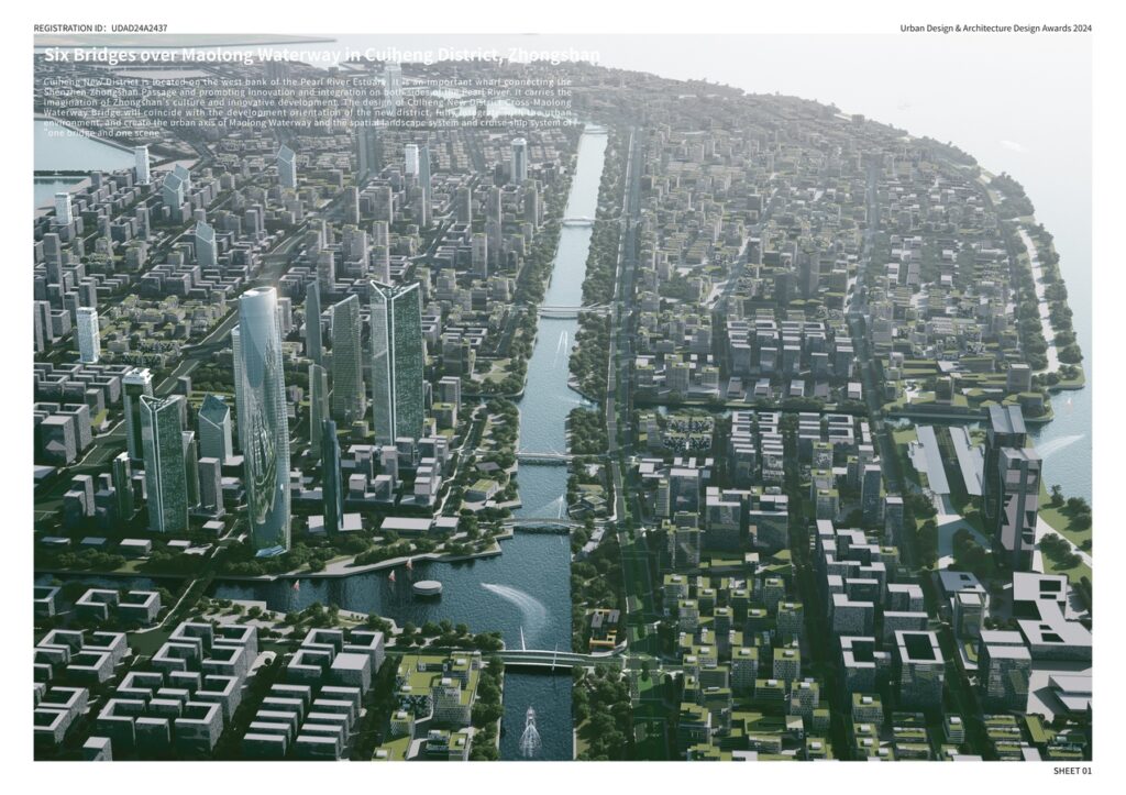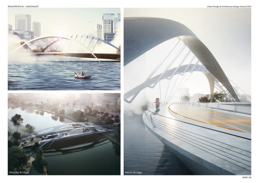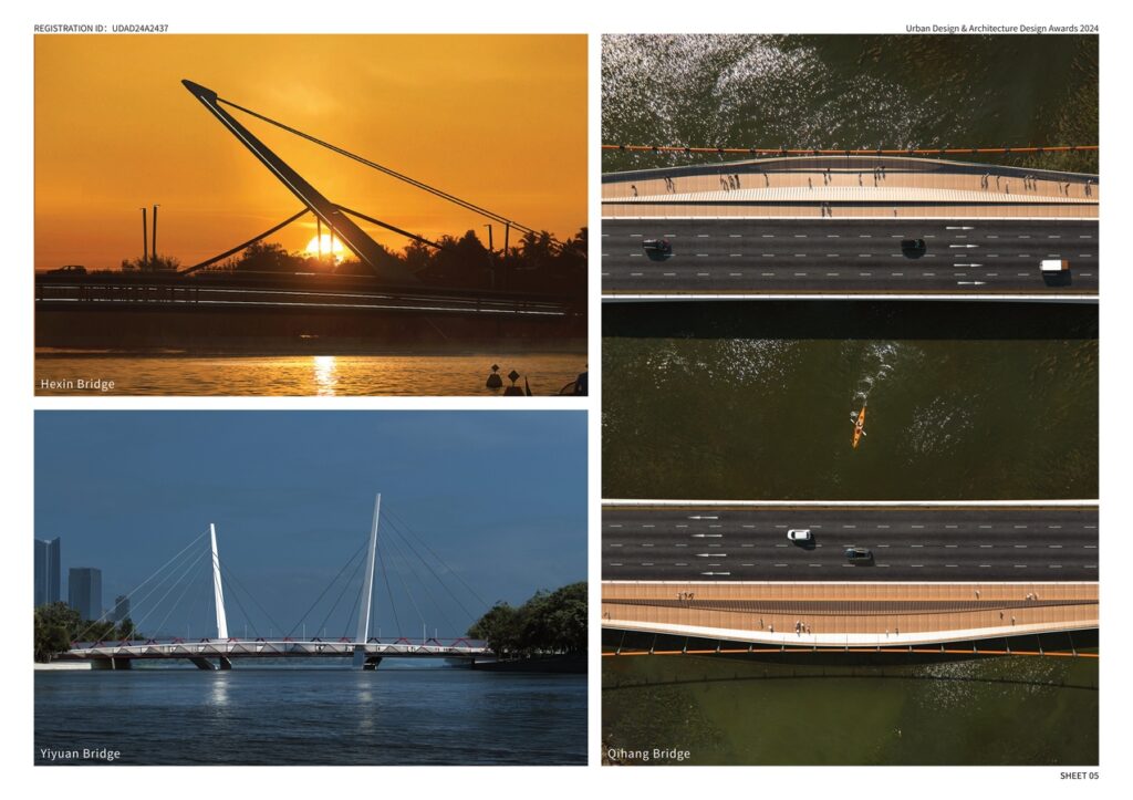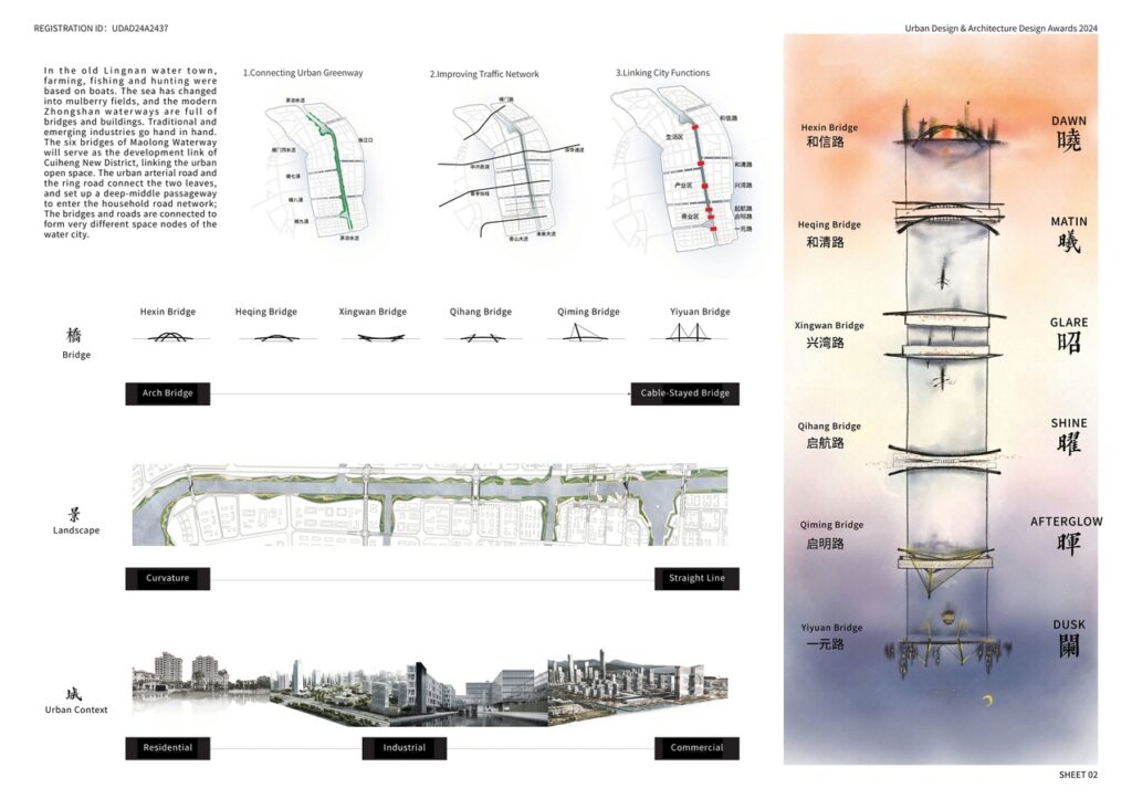 The bridges deriving from a traditional arch form in the living area shows the tranquility of the hazy sunrise and the waterfront life during the morning. The industrial zone under the dazzling sun looks forward to the efficiency and vitality of Cuiheng with the bridges reflecting the collaboration system of modern industry.The towering cable-stayed bridges symbolize a dazzling lighthouse of the CBD area at the glowing night when the water and light are distantly connected along Maolong.
