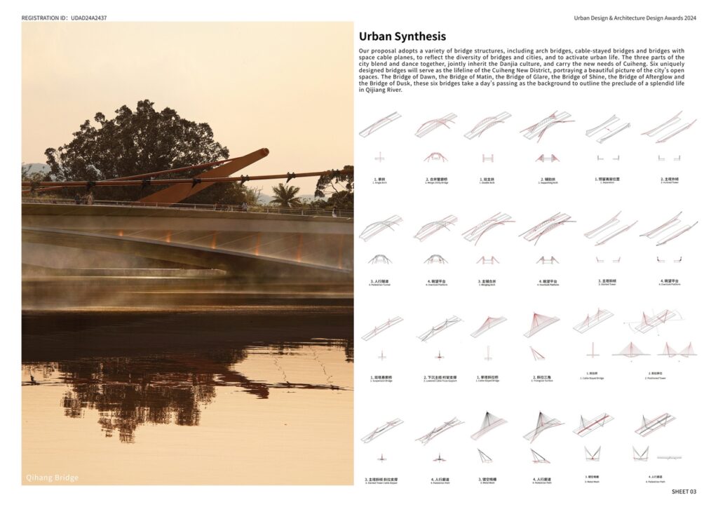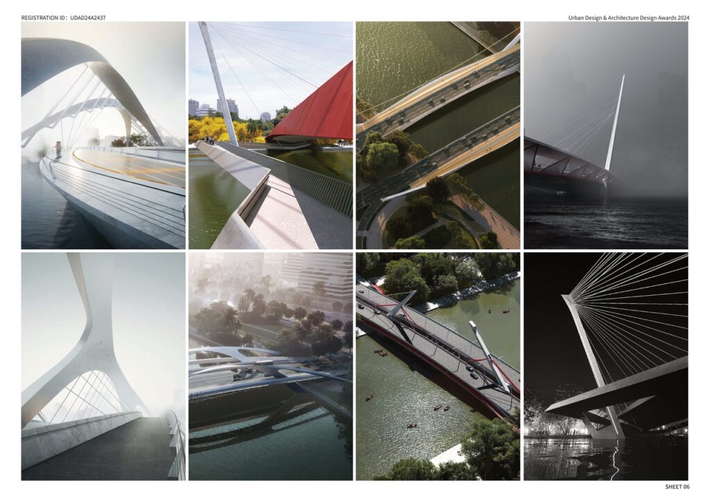The bridge borrowing the suspension and cable-stayed collaborative system as a prototype, sinks down its main cable and support itself on the truss. The inclined main tower combines with the back ropes. The pedestrian bridge flies like a thin rainbow. Bridge Yao is ready to sail like a ship with its sails set.