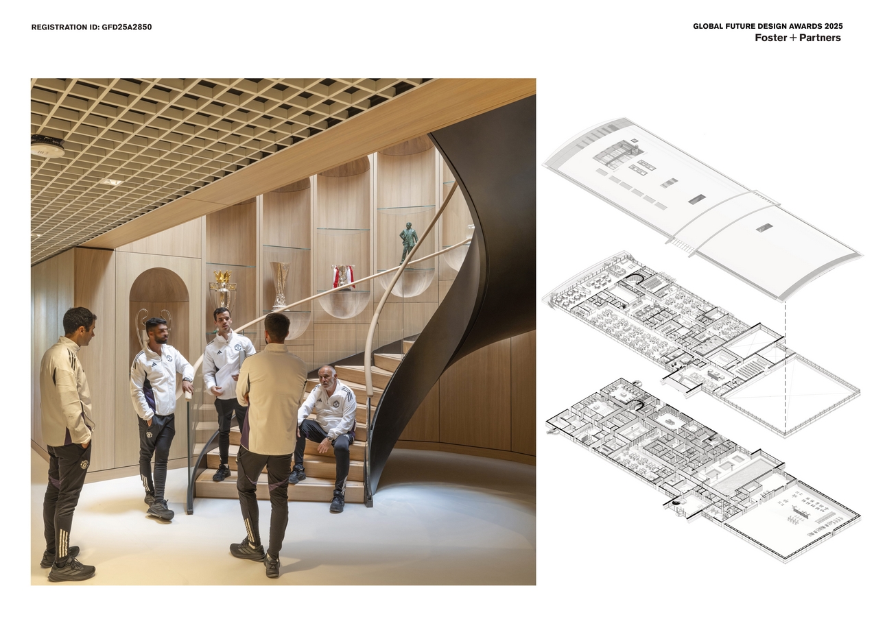 The design facilitates constant care, monitoring, and support for players. A separate players’ entrance – on the south side of the building – is designed to provide an effortless journey from the car park to the dressing room area. Its expansive glass façade and entrance canopy transform the experience of arrival. The ground floor of the building features a hydration and nutrition space, a gym with an altitude room and hydrotherapy pools, as well as new changing areas, medical suites with MRI and CT scanners, and recovery spaces. A striking spiral staircase takes players to the main lounge on the first floor, which features a continuous glass façade and an outdoor terrace overlooking the pitches. A dining area in the centre of the lounge connects with a state-of-the-art kitchen to support players’ nutrition. Open plan offices for coaching staff are positioned on the north and south sides of the building – and there is also a briefing room for post-match feedback. A separate area for media on the upper level includes a conference room for press briefings and a studio for TV and video content.