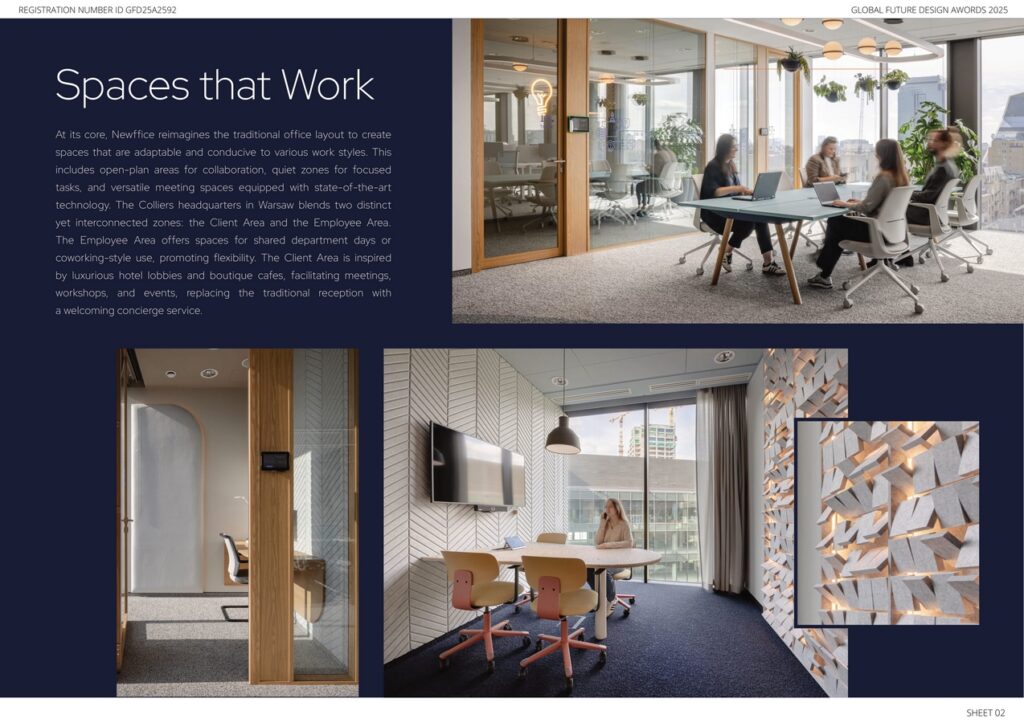 At its core, Newffice reimagines the traditional office layout to create spaces that are adaptable and conducive to various work styles. This includes open-plan areas for collaboration, quiet zones for focused tasks, and versatile meeting spaces equipped with state-of-the-art technology. The Colliers headquarters in Warsaw blends two distinct yet interconnected zones: the Client Area and the Employee Area. The Employee Area offers spaces for shared department days or coworking-style use, promoting flexibility. The Client Area is inspired by luxurious hotel lobbies and boutique cafes, facilitating meetings, workshops, and events, replacing the traditional reception with a welcoming concierge service.