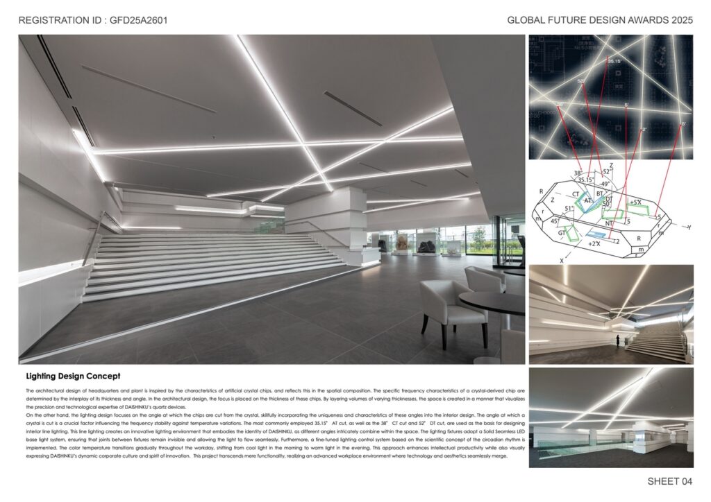 The interior lighting is designed with a focus on the angles of the chips cut from crystal. The thickness of the processed chips is a key factor in determining the device’s resonance frequency, while the angle is an element that affects the stability of that frequency. The most commonly employed 35.15°AT cut, as well as the 38°CT cut and 52°DT cut, is used to design interior line lighting based on these unique angles. This line lighting creates an innovative lighting environment that embodies DAISHINKU’s identity, as different angles intricately combine within the space.