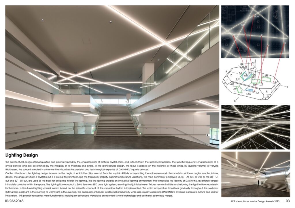 The interior lighting is designed with a focus on the angles of the chips cut from crystal. The thickness of the processed chips is a key factor in determining the device’s resonance frequency, while the angle is an element that affects the stability of that frequency. The most commonly employed 35.15°AT cut, as well as the 38°CT cut and 52°DT cut, is used to design interior line lighting based on these unique angles. This line lighting creates an innovative lighting environment that embodies DAISHINKU’s identity, as different angles intricately combine within the space.