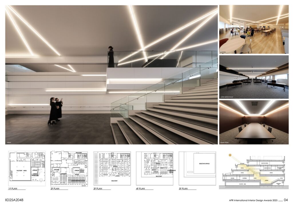 Each floor is organized around an atrium pierced through the center, with natural light from the skylight spreading across each layer. This not only enhances energy efficiency and openness but also stimulates encounters and communication among workers on different floors.
