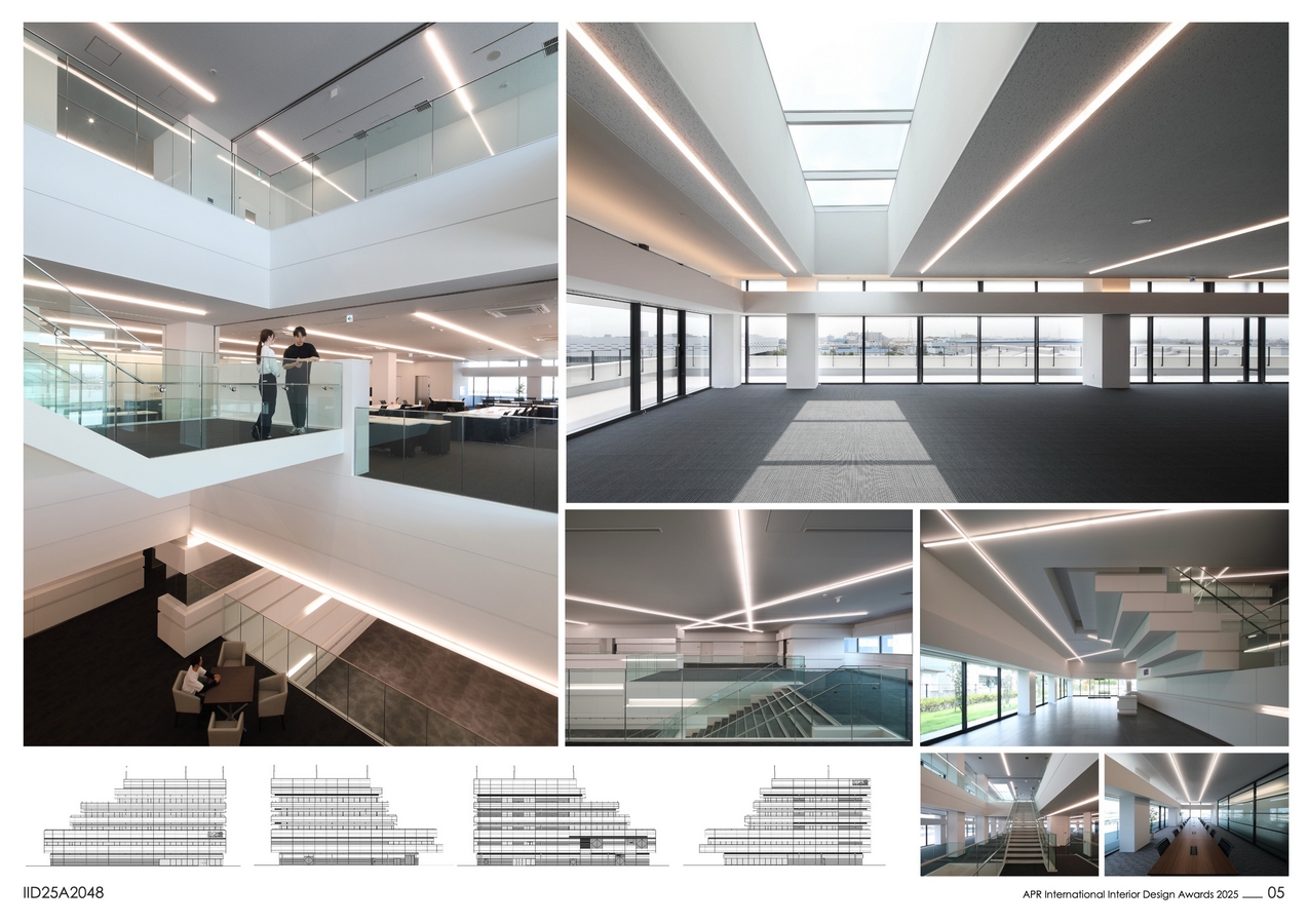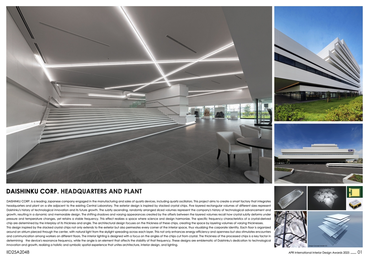 DAISHINKU CORP. is a leading Japanese company engaged in the manufacturing and sales of quartz devices. This project aims to create a smart factory that integrates headquarters and plant functions on a site adjacent to the existing Central Laboratory. The exterior design is inspired by stacked crystal chips. Five layered rectangular volumes of different sizes represent DAISHINKU’s history of technological innovation and its future growth.