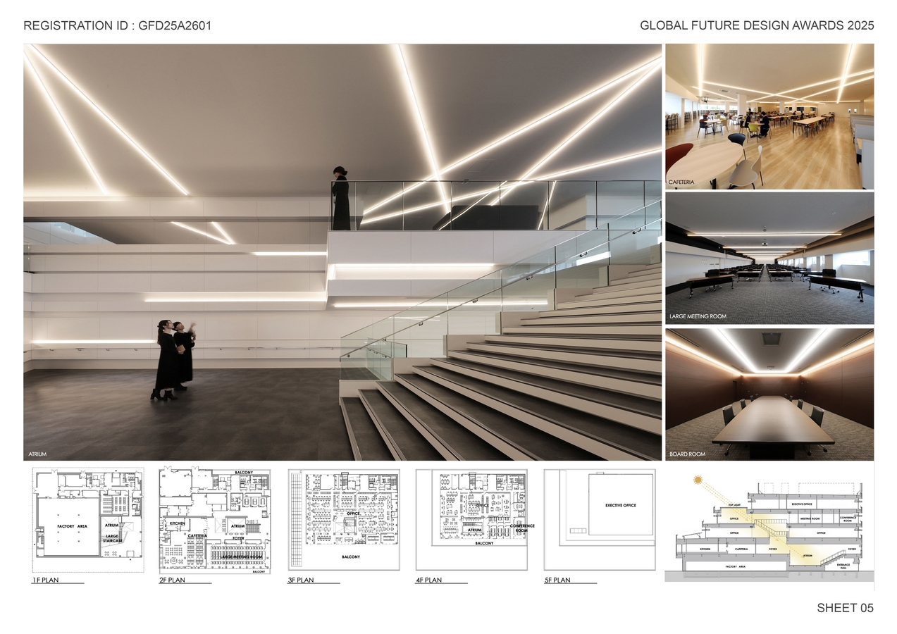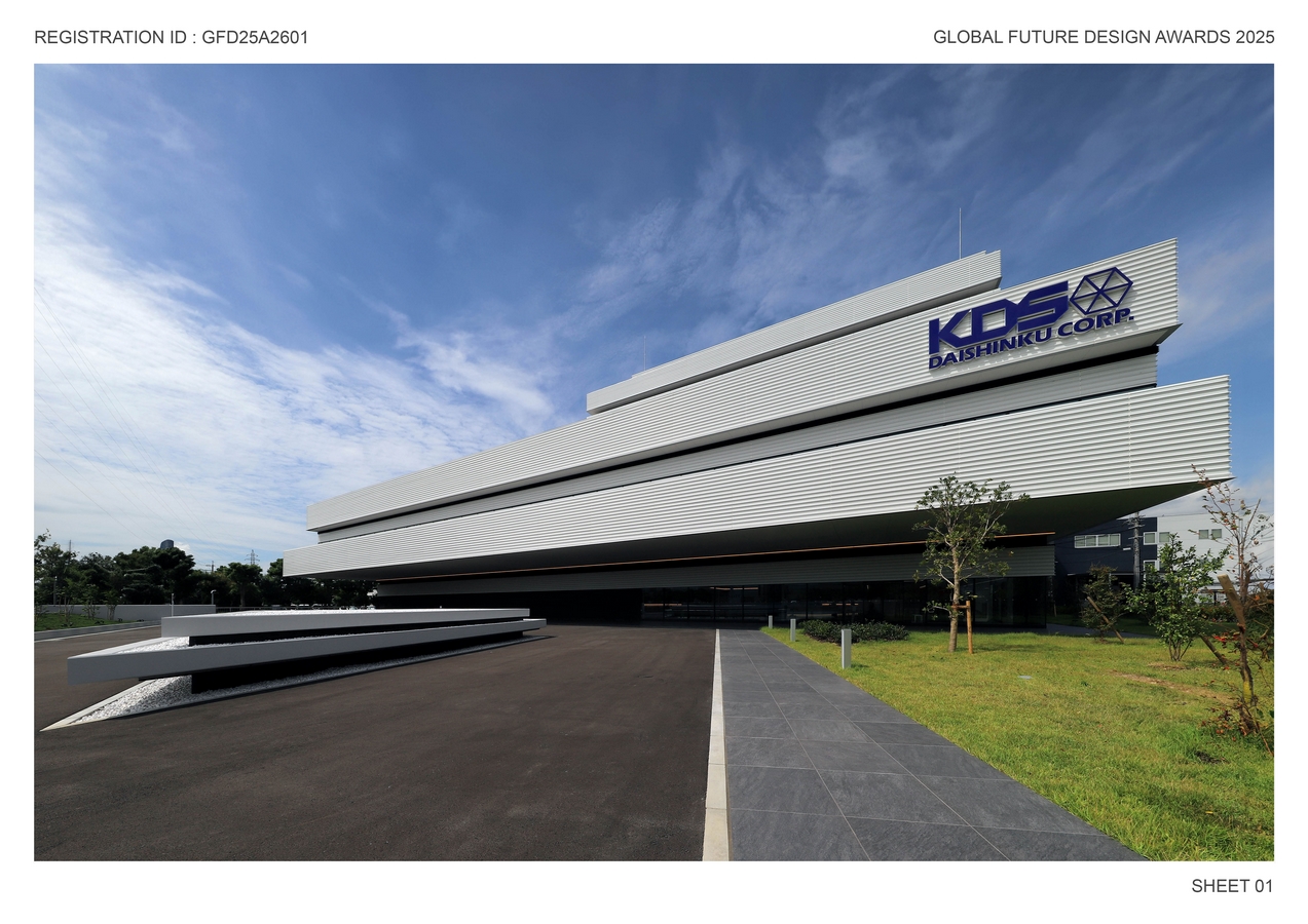 DAISHINKU CORP. is a leading Japanese company engaged in the manufacturing and sales of quartz devices. This project aims to create a smart factory that integrates headquarters and plant functions on a site adjacent to the existing Central Laboratory. The exterior design is inspired by stacked crystal chips. Five layered rectangular volumes of different sizes represent DAISHINKU’s history of technological innovation and its future growth.