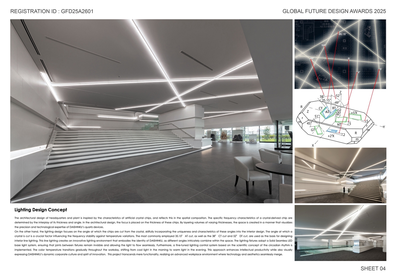 The specific frequency characteristics of a crystal-derived chip are determined by the interplay of its thickness and angle. The architectural design focuses on the thickness of these chips, creating the space by layering volumes of varying thicknesses. This design inspired by the stacked crystal chips not only extends to the exterior but also permeates the interior space, thus visualizing the corporate identity.