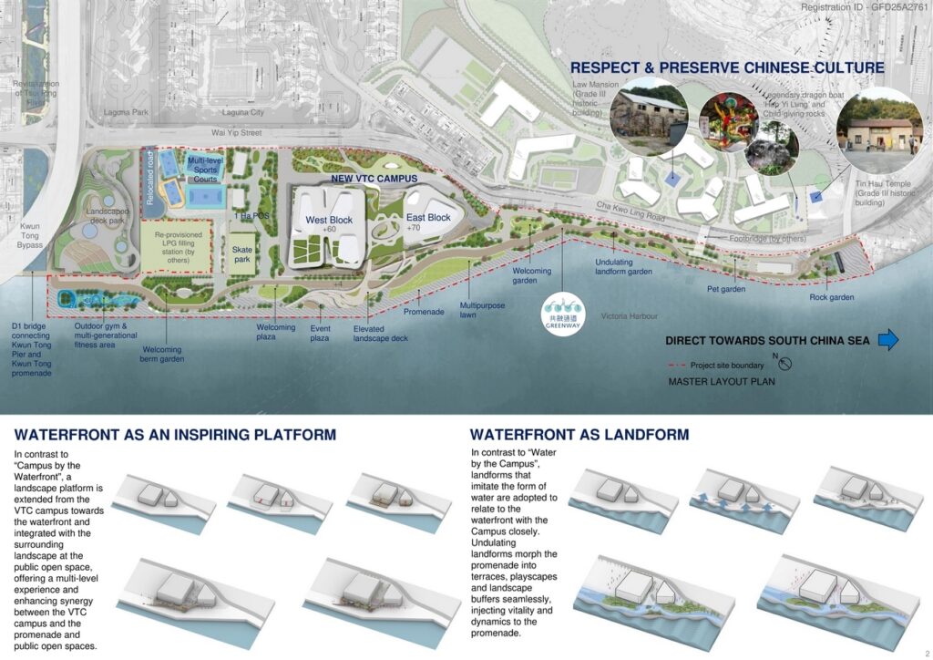 Scale | GFA of VTC campus 180,000m2; site area of VTC campus 32,000m2. Total site area including adjoining public open space development approx. 97,650m2. | ||||