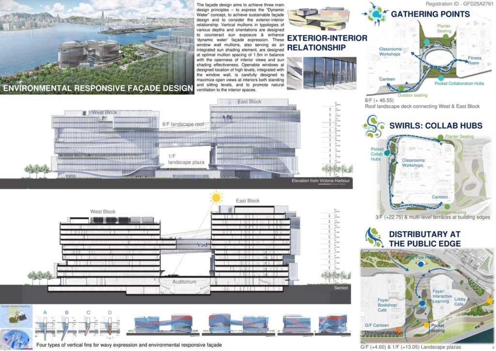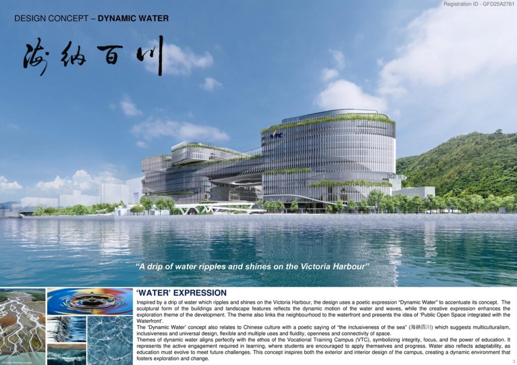The design concept – “Dynamic Water” is adopted to present a distinctive and innovative image. The architectural and landscape design language using sculptural curvy form reflects dynamic motion of water and waves, promotes connectivity to neighbourhood and enhances fluidity of circulation. The water concept also relates to a Chinese saying “海納百川” which suggests universal and integrated design.