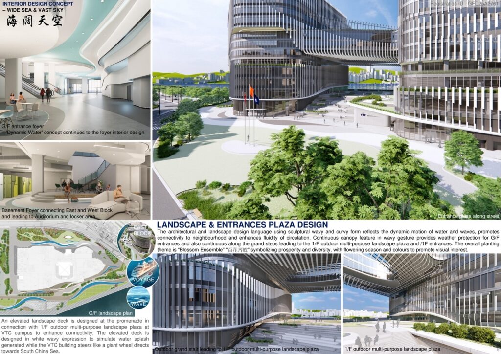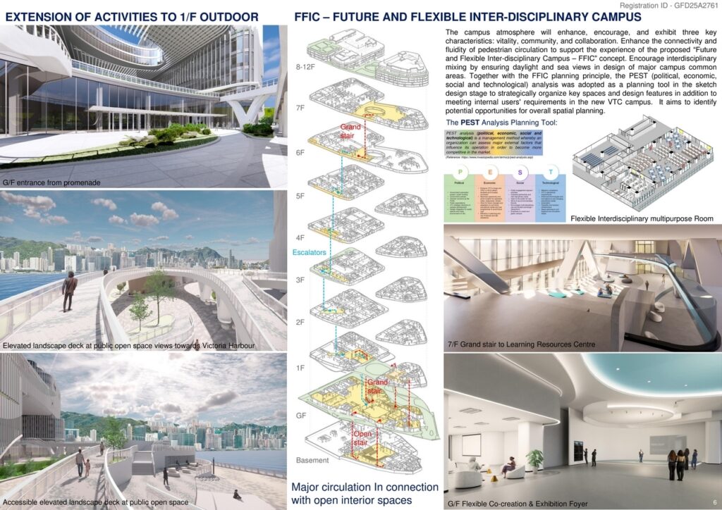 The overall planting theme- “Blossom Ensemble” “百花齊放” symbolizing prosperity and diversity, with flowering season and colours to promote visual interest. Together with interior design concept of “Wide Sea and Vast Sky” “海闊天空”, “Future and Flexible Inter-disciplinary Campus” (FFIC) planning principle was adopted with the PEST (Political, Economic, Social and Technological) analysis as a planning tool to identify potential opportunities for overall spatial planning. The design embodies philosophy of “海納百川” (sea embraces all rivers), fostering inclusivity and integration in VPET. Inspired by “百花齊放” (Blossom Ensemble), we celebrate diverse talents and aspirations of our students, creating an environment where every individual can thrive. “海闊天空” (Wide Sea and Vast Sky) symbolizes our commitment to limitless opportunities for exploration and growth, aligning with VTC’s vision of a future-ready, interdisciplinary campus at Kowloon East.