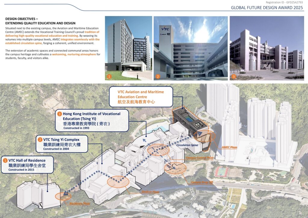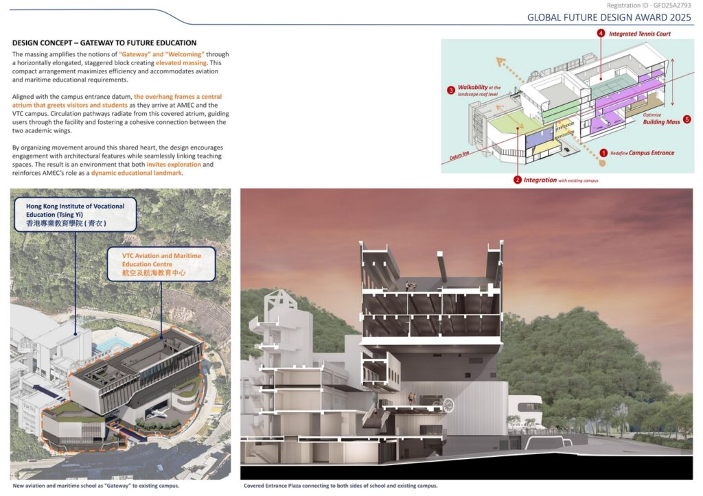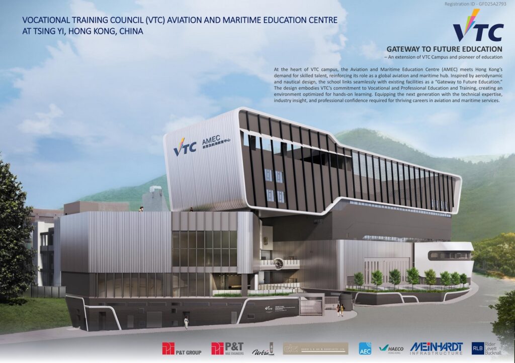 At the heart of VTC campus, the Aviation and Maritime Education Centre (AMEC) meets Hong Kong’s demand for skilled talent, reinforcing its role as a global aviation and maritime hub. Inspired by aerodynamic and nautical design, the school links seamlessly with existing facilities as a “Gateway to Future Education.” The design embodies VTC’s commitment to Vocational and Professional Education and Training, creating an environment optimized for hands-on learning. Equipping the next generation with technical expertise, industry insight, and professional confidence required for thriving careers in aviation and maritime services.