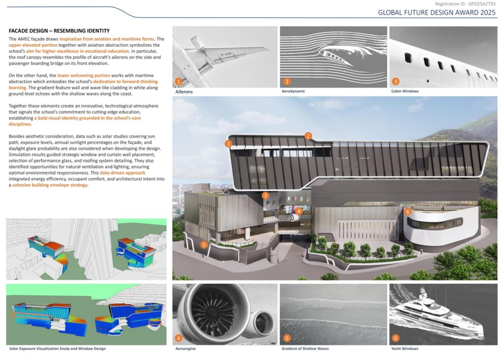 Besides aesthetic consideration, data such as solar studies covering sun path, exposure levels, annual sunlight percentages on the façade, and daylight glare probability are also considered when developing the design. Simulation results guided strategic window and curtain wall placement, selection of performance glass, and roofing system detailing. They also identified opportunities for natural ventilation and lighting, ensuring optimal environmental responsiveness. This data-driven approach integrated energy efficiency, occupant comfort, and architectural intent into a cohesive building envelope strategy. AMEC stands as a transformative beacon for vocational training in Hong Kong, uniting innovative aerodynamic and nautical architectural forms with seamless campus integration and educational symbolism, positioning the Centre as an enduring catalyst for talent and sectoral advancement in a dynamic global context.