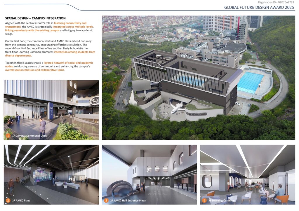 The massing amplifies the notions of “Gateway” and “Welcoming” through a horizontally elongated, staggered block creating elevated massing. This compact arrangement maximizes efficiency and accommodates aviation and maritime educational requirements. Aligned with the campus entrance datum, the overhang frames a central atrium that greets visitors and students as they arrive at AMEC and the VTC campus. Circulation pathways radiate from this covered atrium, guiding users through the facility and fostering a cohesive connection between the two academic wings. By organizing movement around this shared heart, the design encourages engagement and sharing. The result is an environment that both invites exploration and reinforces AMEC’s role as a dynamic educational landmark.