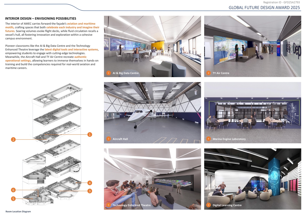 At the heart of VTC campus, the Aviation and Maritime Education Centre (AMEC) meets Hong Kong’s demand for skilled talent, reinforcing its role as a global aviation and maritime hub. Inspired by aerodynamic and nautical design, the school links seamlessly with existing facilities as a “Gateway to Future Education.” The design embodies VTC’s commitment to Vocational and Professional Education and Training, creating an environment optimized for hands-on learning. Equipping the next generation with technical expertise, industry insight, and professional confidence required for thriving careers in aviation and maritime services.
