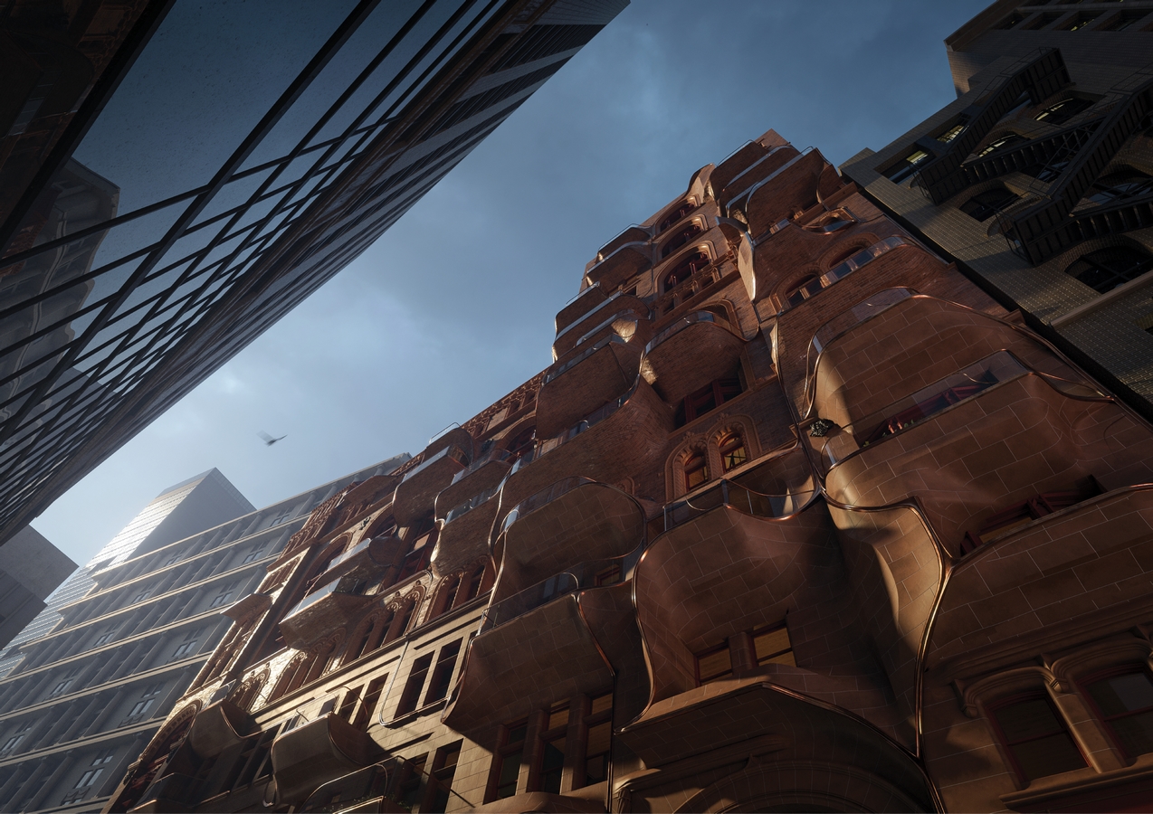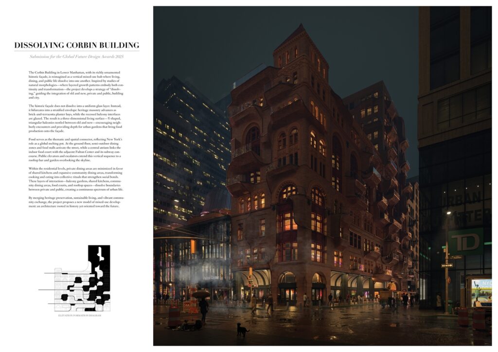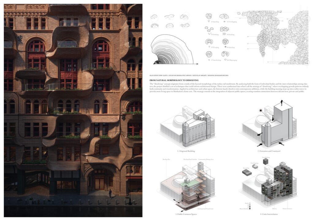 The Corbin Building in Lower Manhattan, with its richly ornamented historic façade, is reimagined as a vertical mixed-use hub where living, dining, and public life dissolve into one another. Inspired by studies of natural morphologies—where layered growth patterns embody both continuity and transformation—the project develops a strategy of “dissolving,” guiding the integration of old and new, private and public, building and city.