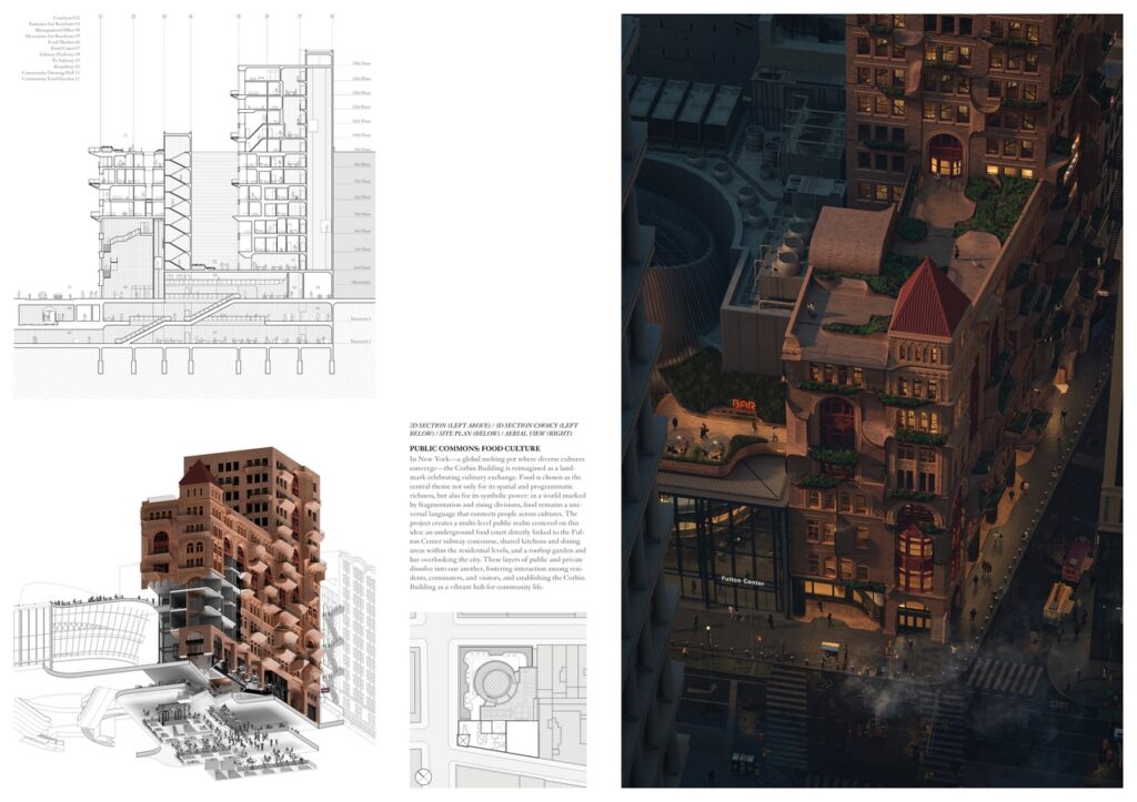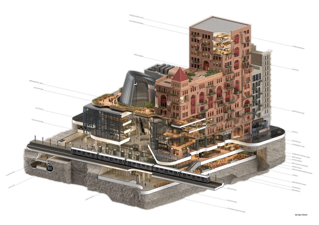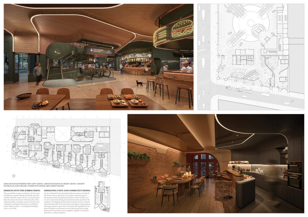 Food serves as the thematic and spatial connector, reflecting New York’s role as a global melting pot. At the ground floor, semi-outdoor dining zones and food stalls activate the street, while a central atrium links the indoor food court with the adjacent Fulton Center and its subway concourse. Public elevators and escalators extend this vertical sequence to a rooftop bar and garden overlooking the skyline.