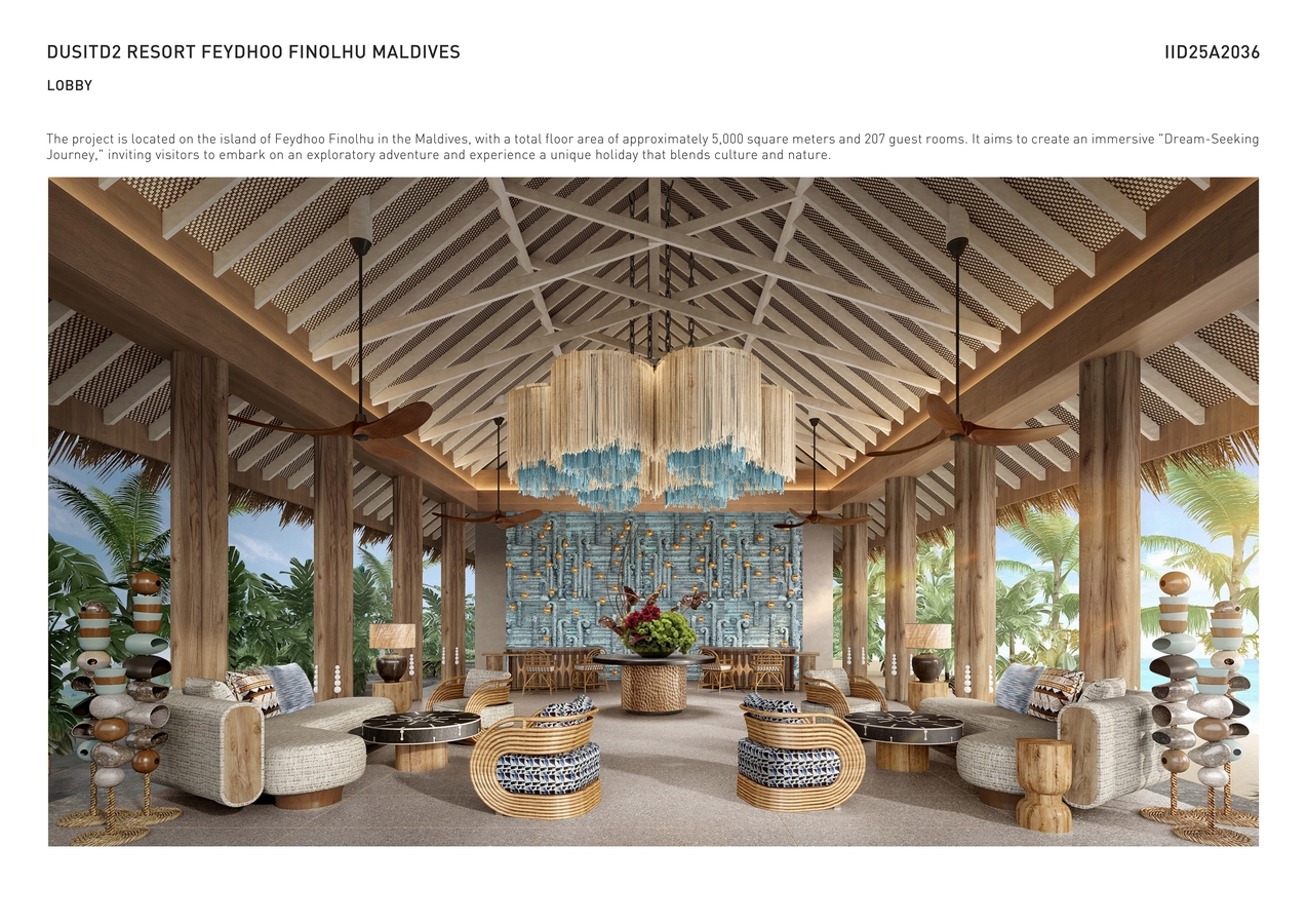 The project is located on the island of Feydhoo Finolhu in the Maldives, with a total floor area of approximately 5,000 square meters and 207 guest rooms. It aims to create an immersive “Dream-Seeking Journey,” inviting visitors to embark on an exploratory adventure and experience a unique holiday that blends culture and nature.