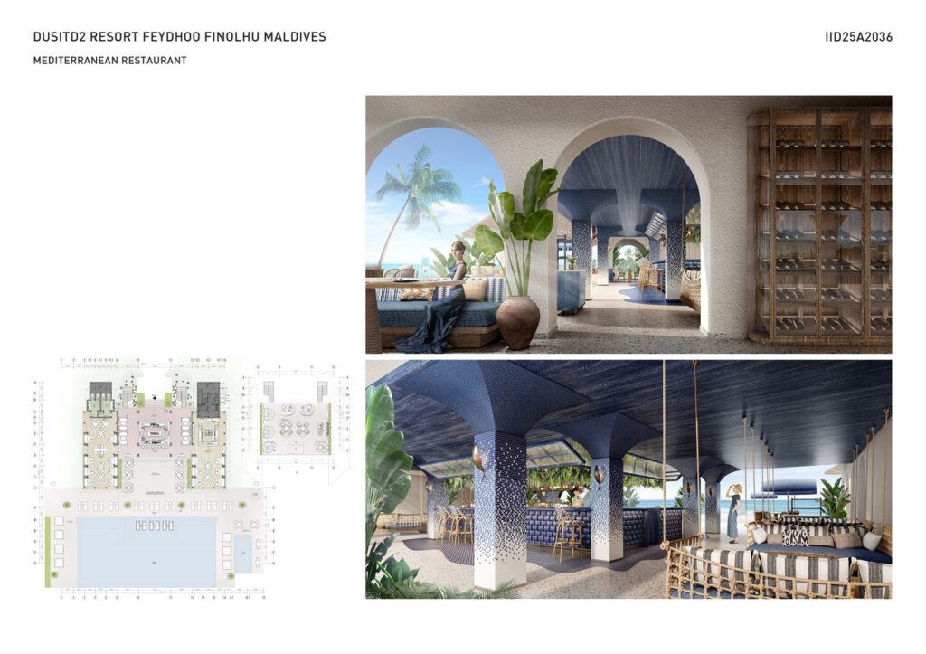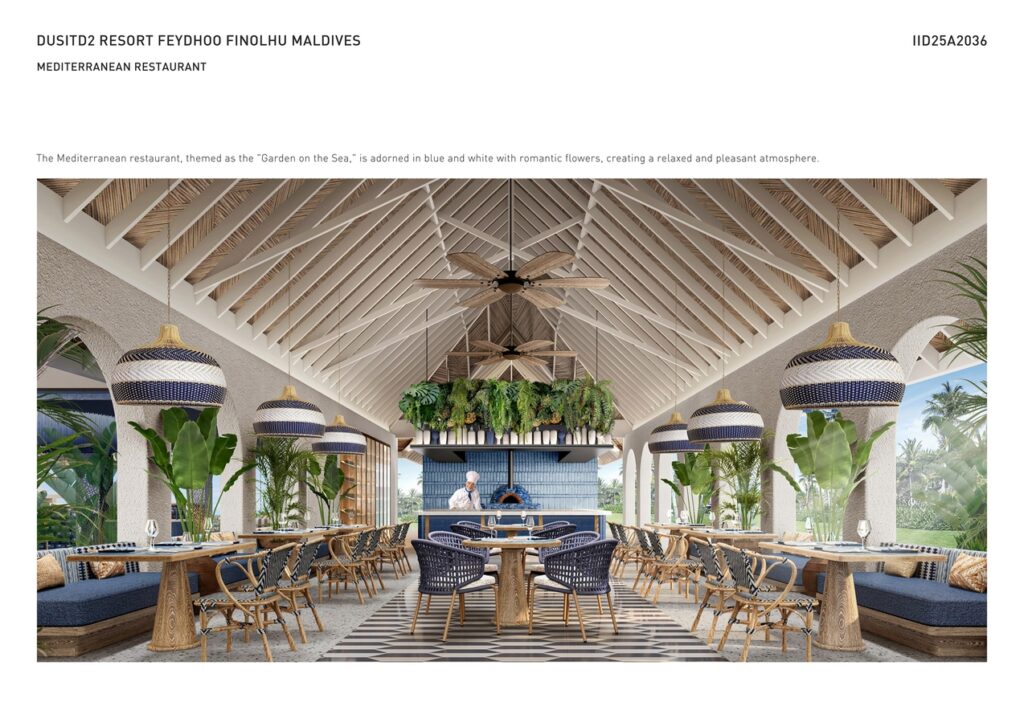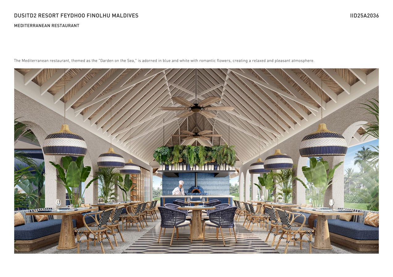 The Mediterranean restaurant, themed as the “Garden on the Sea,” is adorned in blue and white with romantic flowers, creating a relaxed and pleasant atmosphere. The Thai restaurant combines Thai architectural elements with traditional colors to offer an authentic cultural experience. The overwater restaurant, as the island’s most exclusive private custom dining venue, integrates details of Chinese mortise and tenon craftsmanship, focusing on Asian cuisine to craft an ultimate luxurious dining experience on the sea.