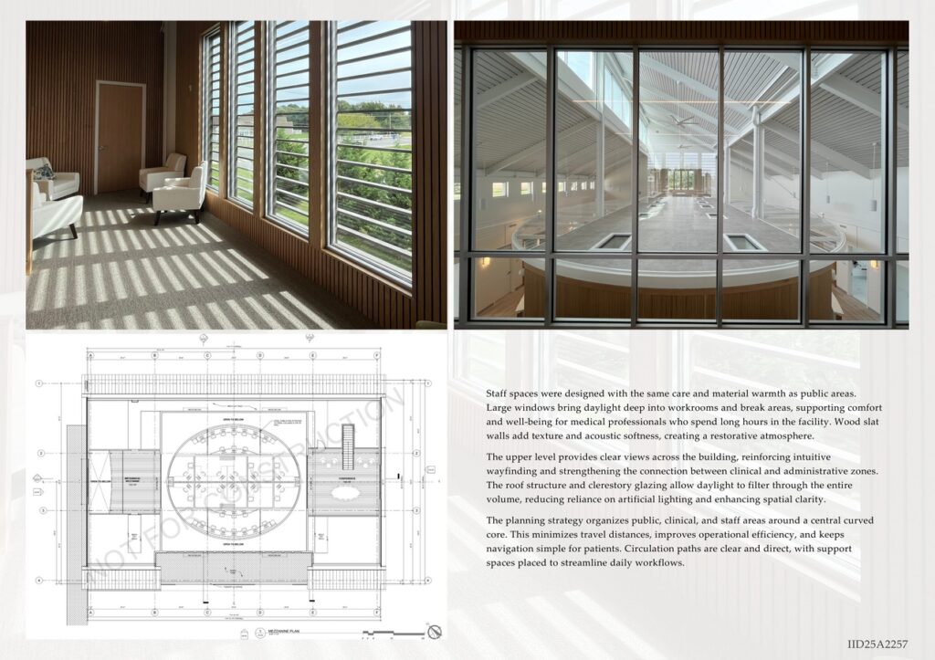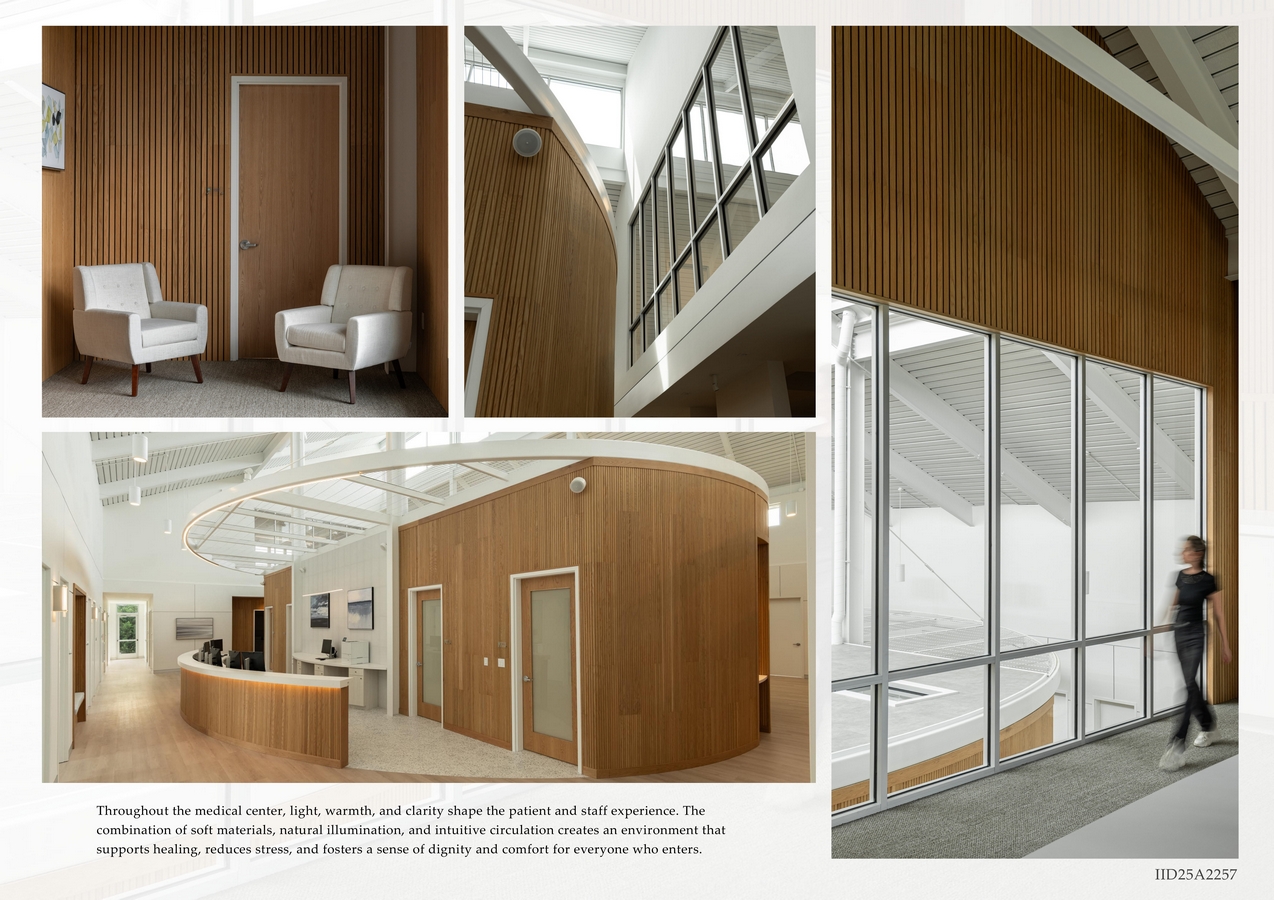 Throughout the medical center, light, warmth, and clarity shape the patient and staff experience. The combination of soft materials, natural illumination, and intuitive circulation creates an environment that supports healing, reduces stress, and fosters a sense of dignity and comfort for everyone who enters