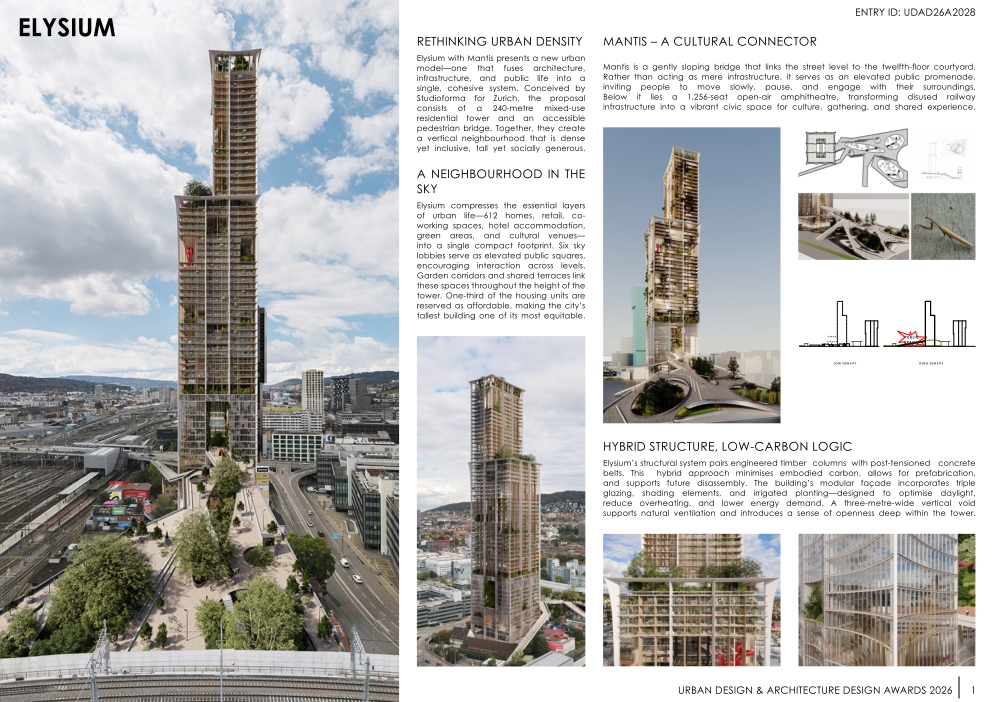 Elysium with Mantis presents a new urban model—one that fuses architecture, infrastructure, and public life into a single, cohesive system. Conceived by Studioforma for Zurich, the proposal consists of a 240-metre mixed-use residential tower and an accessible pedestrian bridge. Together, they create a vertical neighbourhood that is dense yet inclusive, tall yet socially generous.