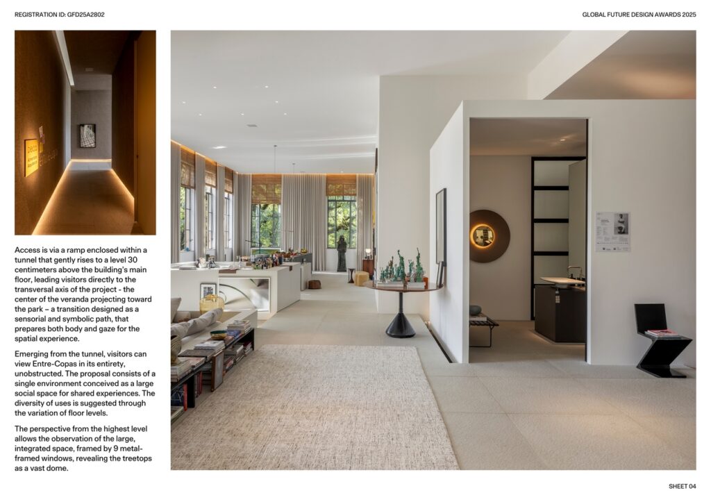 Access is via a ramp enclosed within a tunnel that gently rises 30 centimeters above the building’s main floor, leading visitors directly to the transversal axis of the project – the center of the veranda projecting toward the park –, a transition designed as a sensorial and symbolic path, that prepares body and gaze for the spatial experience.