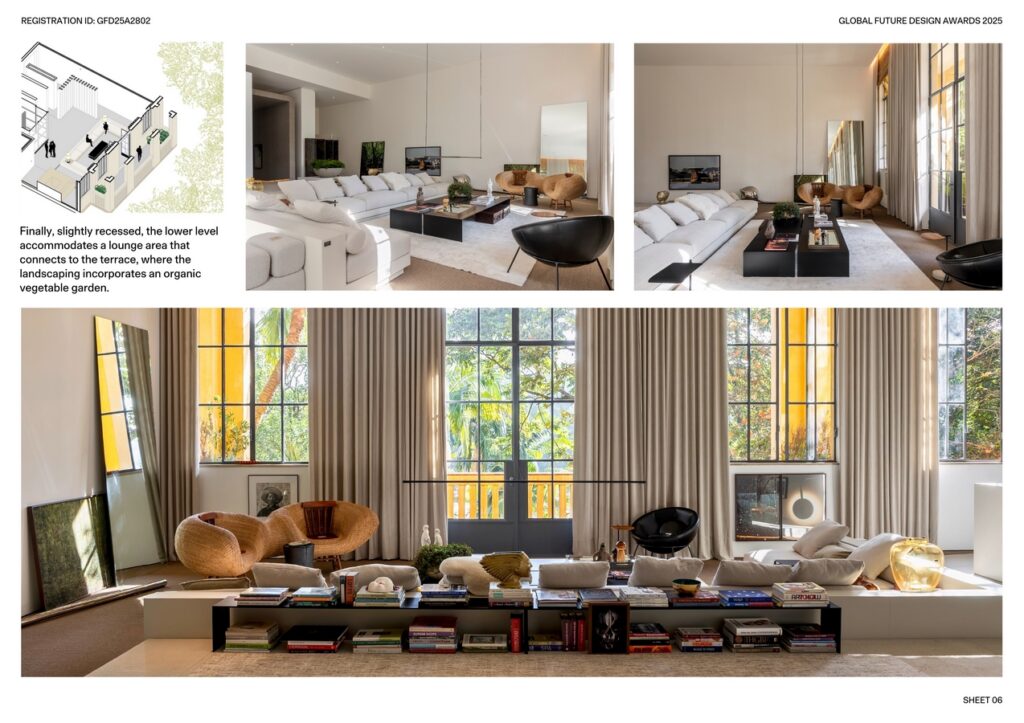 Finally, slightly recessed, the lower level accommodates a lounge area that connects to the terrace, where the landscaping incorporates an organic vegetable garden.