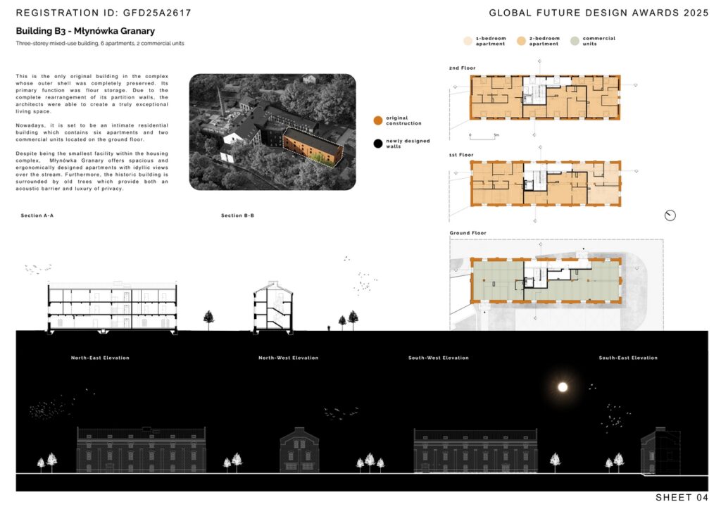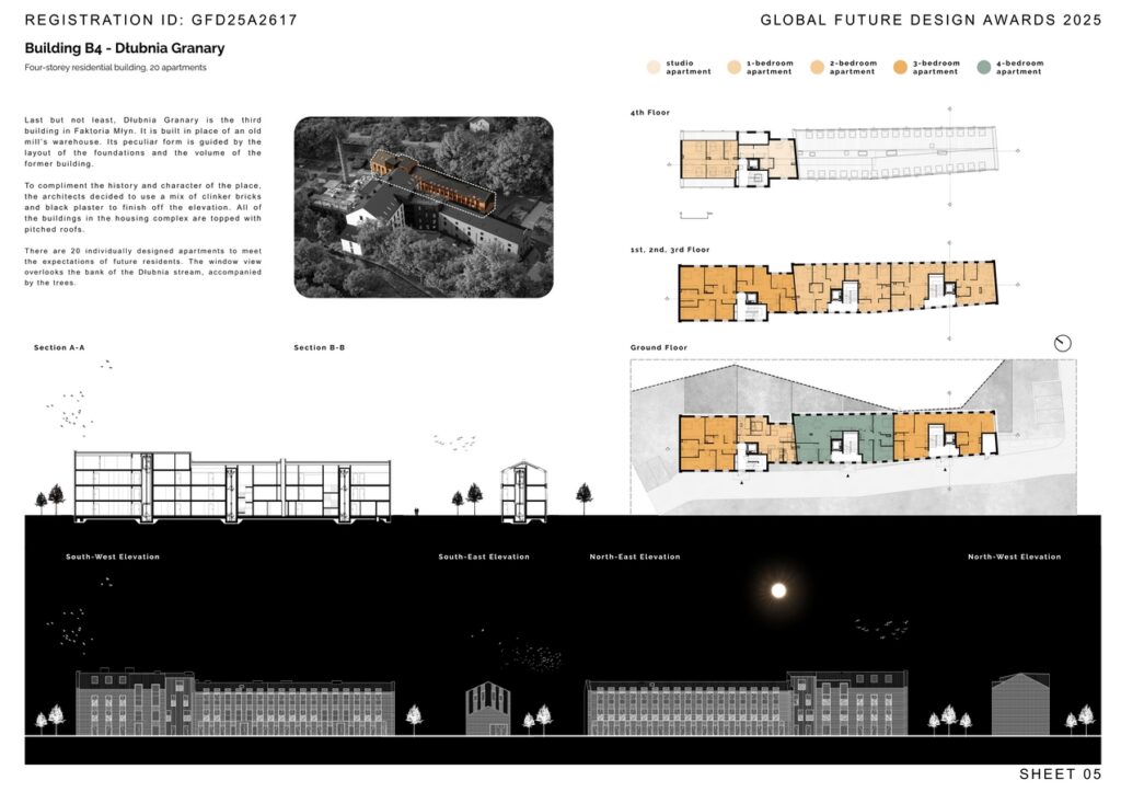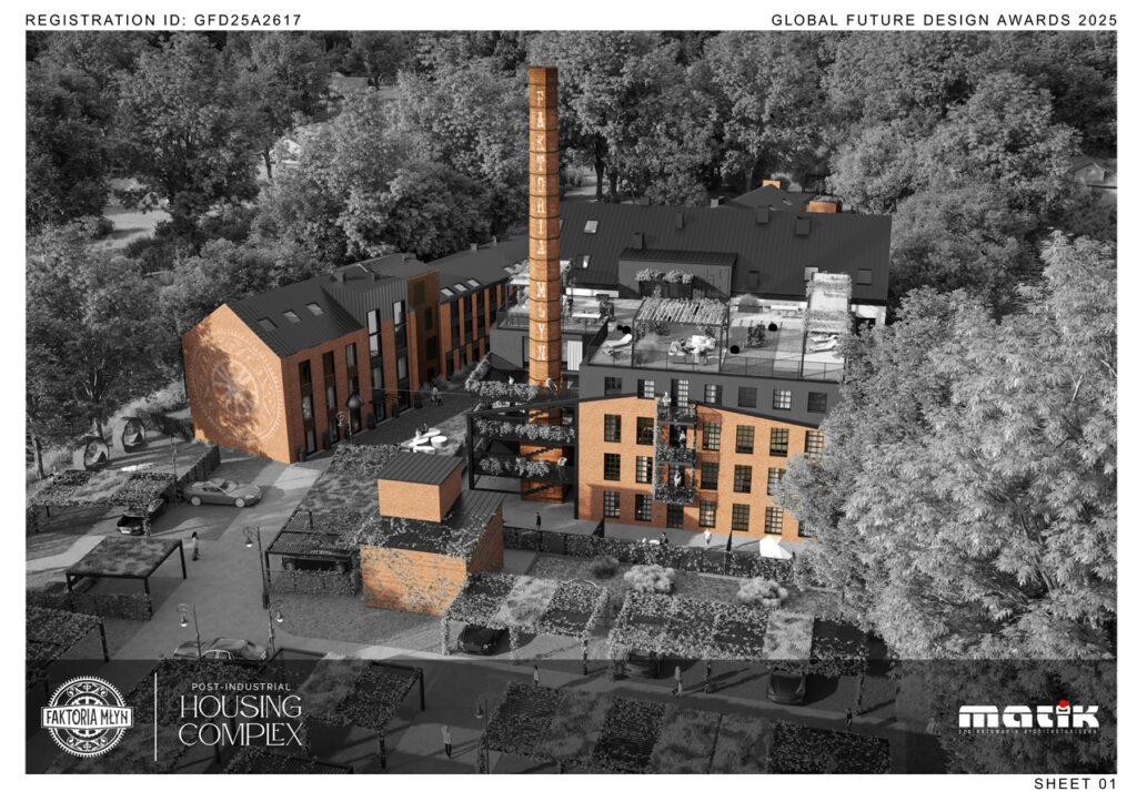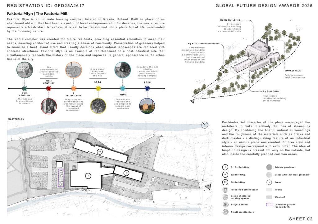 It is located in a peaceful neighbourhood in Cracow, Poland, where future residents would live among the blissful nature. Faktoria Młyn is an excellent example of refurbishment of a post-industrial site that simultaneously respects the history of the place and improves its general reappearance in the urban tissue. Preservation of the majority of greenery helped to minimise a heat island that usually develops when natural landscapes are replaced with concrete structures.