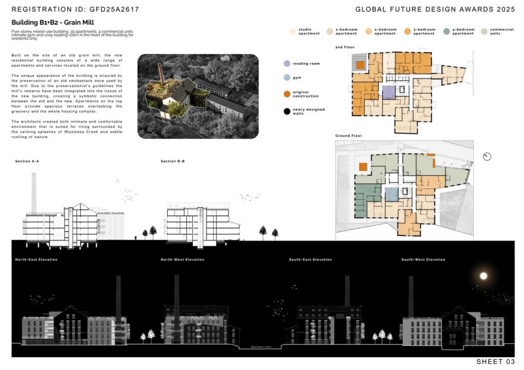 B1+B2 Building (Grain Mill) is a five-storey mixed-use building built in place of an old grain mill. It houses 39 apartments, 4 commercial units, intimate gym and reading room for residents only. An unique appearance of the building is guaranteed by the preservation of an old smokestack, once used by the mill. Due to preservationist’s guidelines the mill’s remains have been composed into the tissue of a new building, creating a symbolic connection between past and future. Apartments on the top