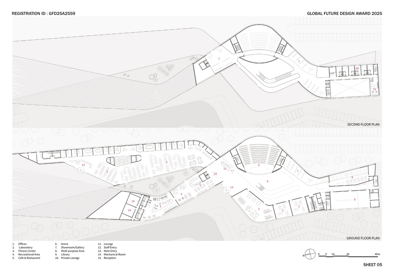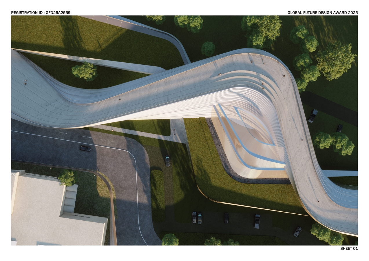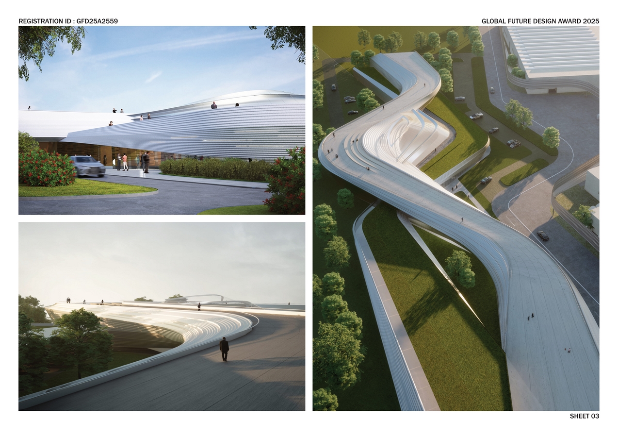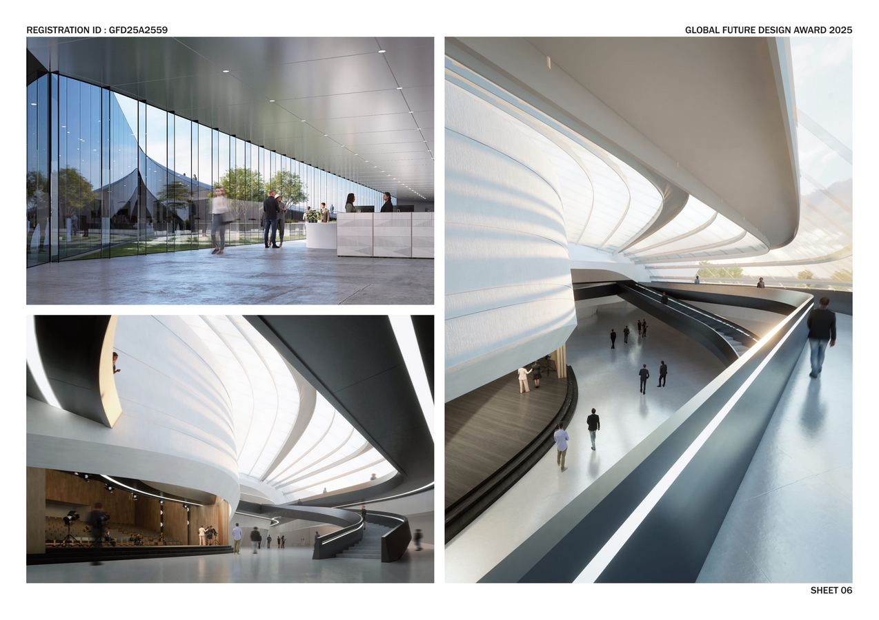 The architectural form of the headquarters features two intertwined strands, each serving distinct yet complementary purposes. One strand is dedicated to work and research spaces, fostering focused innovation and development. The other strand provides areas for relaxation, social engagement, and visitor interaction, encouraging a holistic approach to workplace design. Together, these strands create a vibrant spatial experience, integrating key architectural elements such as an arena, a central courtyard, and accessible roof gardens. These features promote creativity, interaction, and sustainability, aligning with FITT’s mission and values.