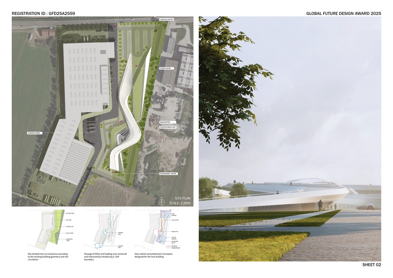 The geometry of the new building is rooted in the site strategy, derived from dividing the site into curved pieces. This approach takes cues from the existing building massing and the established circulation of heavy goods vehicles (HGVs). By integrating the building with the surrounding landscape, the design gives the impression of growing organically from the ground, enhancing its dynamic and fluid form. The design emphasizes interaction and the exchange of ideas, reinforcing FITT’s mission to intertwine creativity and collaboration. The future headquarters stands as a testament to FITT’s vision of a workplace that seamlessly integrates creativity, functionality, and community. It serves as both an incubator for innovation and a vibrant showcase of the company’s forward-thinking culture. With its thoughtful program, sustainable design, and dynamic form, the headquarters will inspire generations to come while setting a benchmark for corporate architecture.
