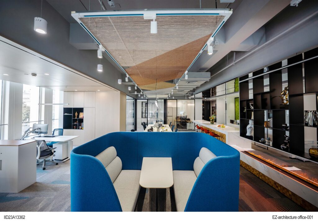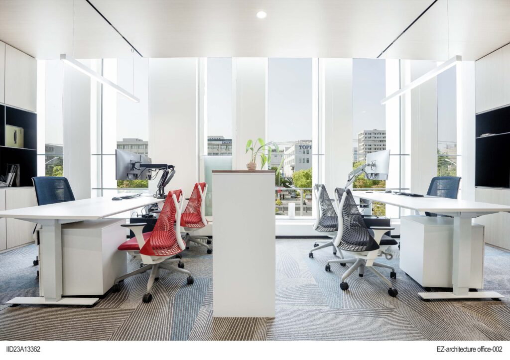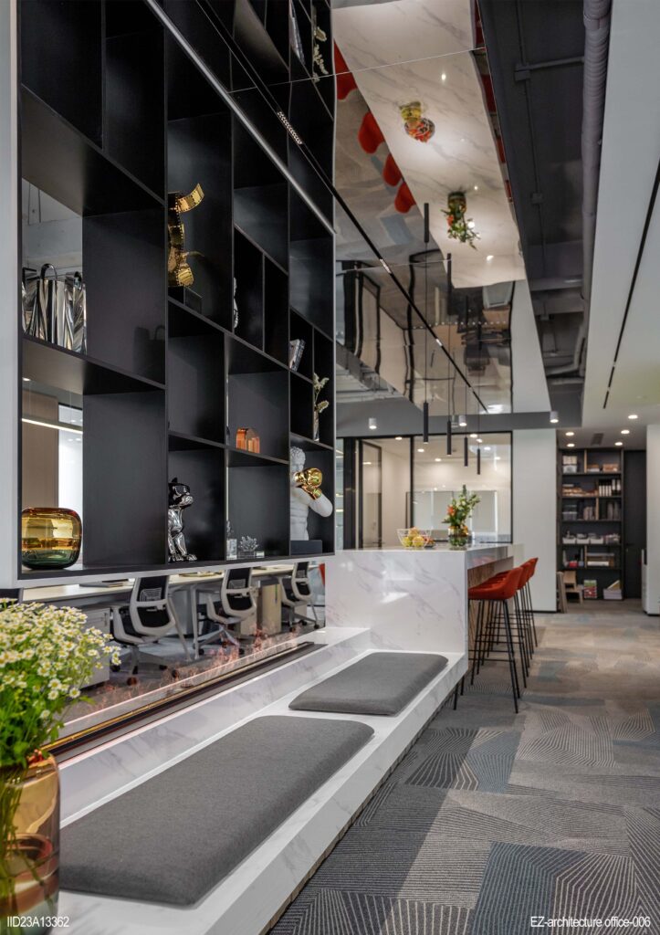 The office places a strong emphasis on lighting design, using clever lighting arrangements to ensure even distribution of light, creating a spacious and bright atmosphere. Large windows provide an abundance of natural light, contributing to an open and transparent feel throughout the office space.