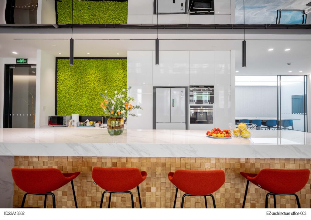 Material selection prioritizes environmentally sustainable options, including recyclable materials and low VOC (volatile organic compound) paints, minimizing the environmental impact. Greenery is strategically placed in various corners of the office, not only purifying the air but also introducing a fresh atmosphere to the workspace.