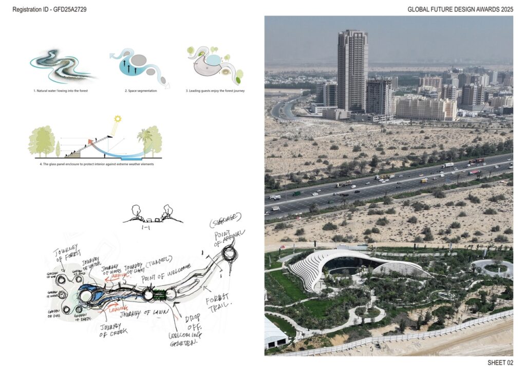 Along the outdoor path, a curated sequence of landscape nodes, including an Amphitheatre, Event Plaza, Quiet Garden, and Garden of Water, offer contemplative and social spaces for visitors to pause and explore. These elements are carefully positioned as moments of discovery, like jewels scattered through the forest, enriching the spatial hierarchy and deepening the integration of nature and the built form.