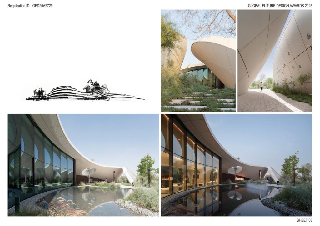 The main building itself is sculpted to echo the organic undulations of a sand dune, rising and falling in tune with the terrain. It appears to grow from the earth, its GRC-stepped exterior wrapping the structure in a flowing, architectural rhythm. On the southern side, a floor-to-ceiling glass façade welcomes in views of a landscaped pond and forest canopy, dissolving the boundary between indoors and out. The result is a serene, immersive atmosphere that evokes a sense of intimacy with the forest and a re-connection to nature.