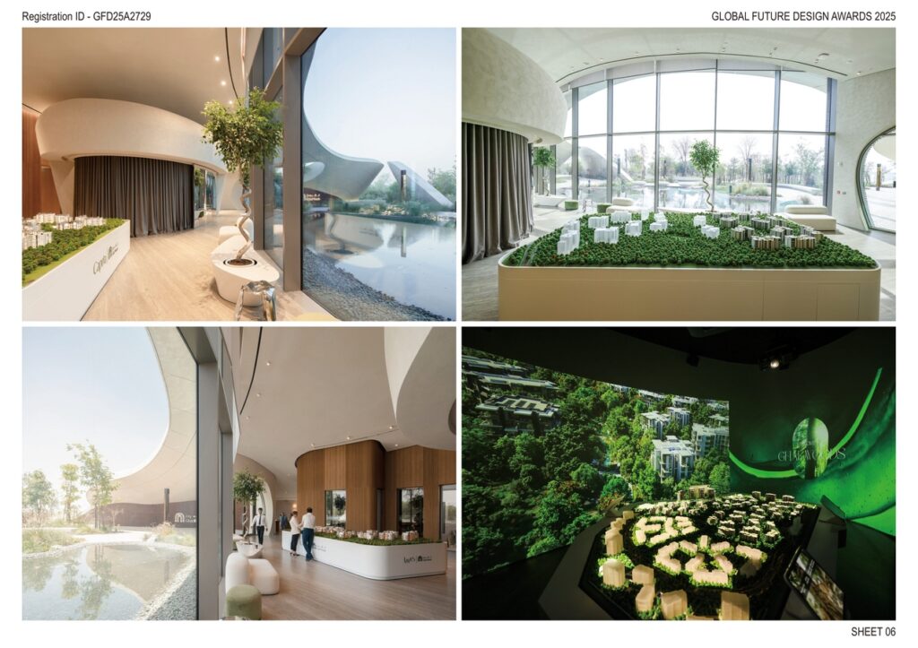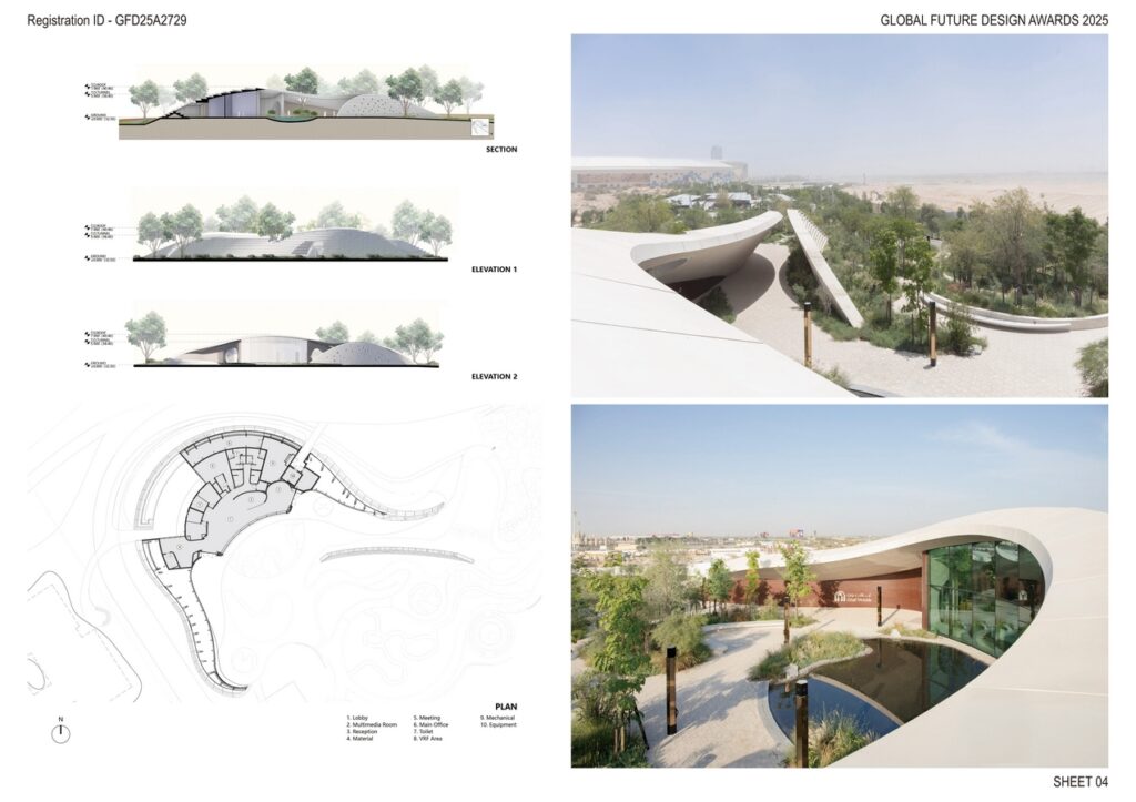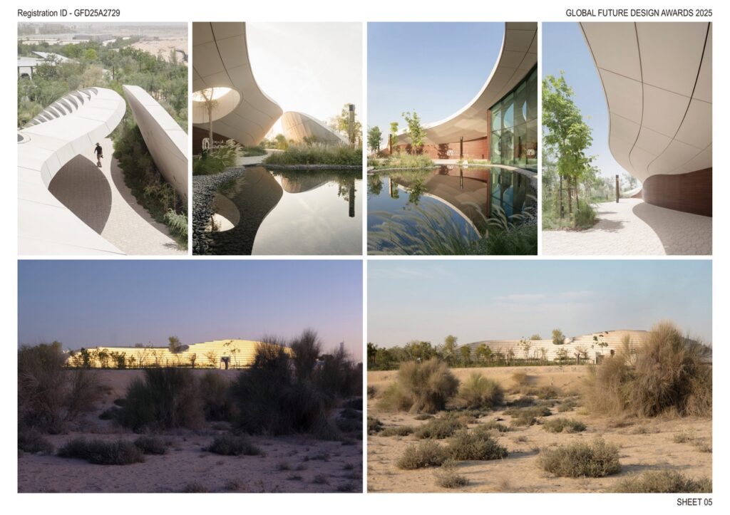Every aspect of the building considers UAE’s climatic conditions. Extended eaves shade the façade, reducing solar gain and improving energy efficiency. The southern water feature contributes to passive cooling by lowering the immediate microclimate. The surrounding forest ecosystem, designed with native and adaptive species, contributes to cooler ambient temperatures across the community compared to the adjacent desert zone, proving how ecological design can directly enhance urban comfort.