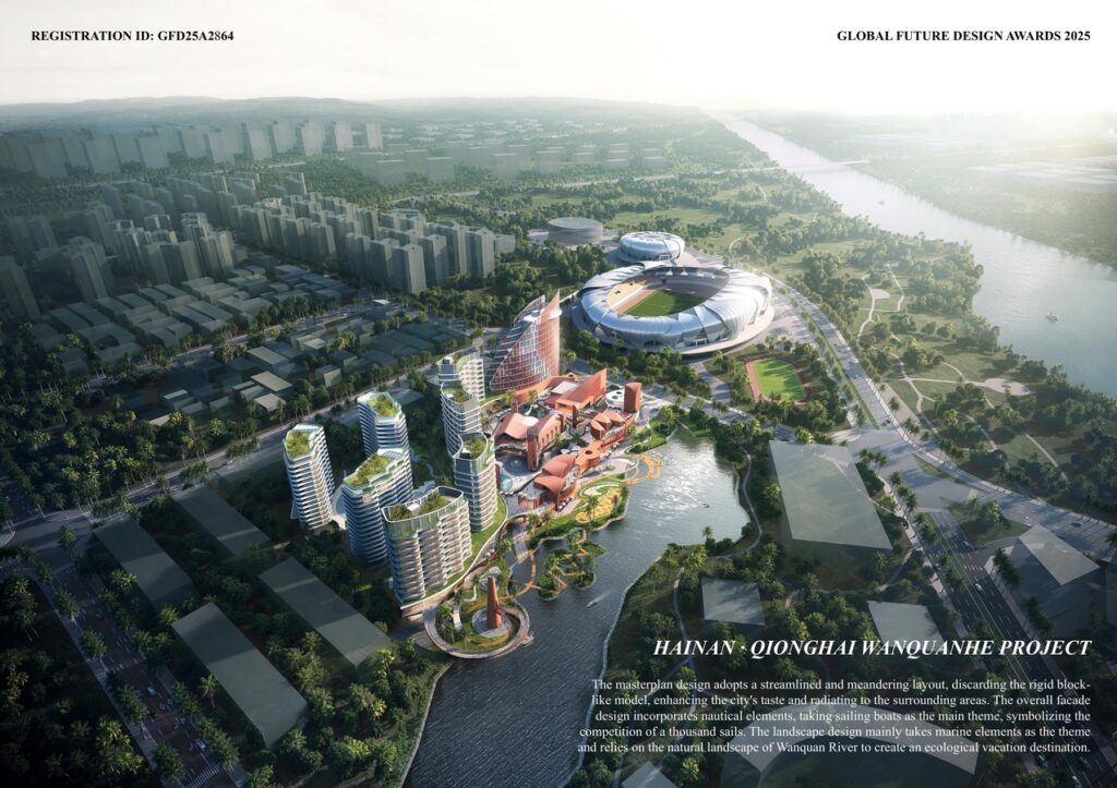 The masterplan design adopts a streamlined and meandering layout, discarding the rigid block-like model, enhancing the city’s taste and radiating to the surrounding areas. The overall facade design incorporates nautical elements, taking sailing boats as the main theme, symbolizing the competition of a thousand sails. The landscape design mainly takes marine elements as the theme and relies on the natural landscape of Wanquan River to create an ecological vacation destination.
