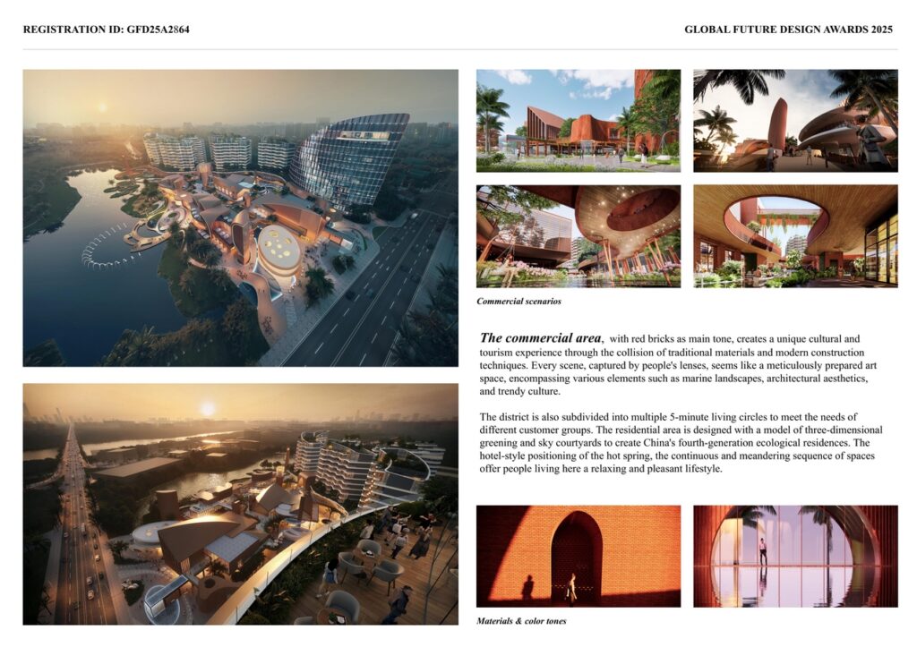 Its commercial area, with red bricks as main tone, creates a unique cultural and tourism experience through the collision of traditional materials and modern construction techniques. Every scene, captured by people’s lenses, seems like a meticulously prepared art space, encompassing various elements such as marine landscapes, architectural aesthetics, and trendy culture. Meanwhile, the commercial district is also subdivided into multiple 5-minute living circles to meet the needs of different customer groups. The residential area is designed with a model of three-dimensional greening and sky courtyards to create China’s fourth-generation ecological residences. The hotel-style positioning of the hot spring, the continuous and meandering sequence of spaces offer people living here a relaxing and pleasant lifestyle.