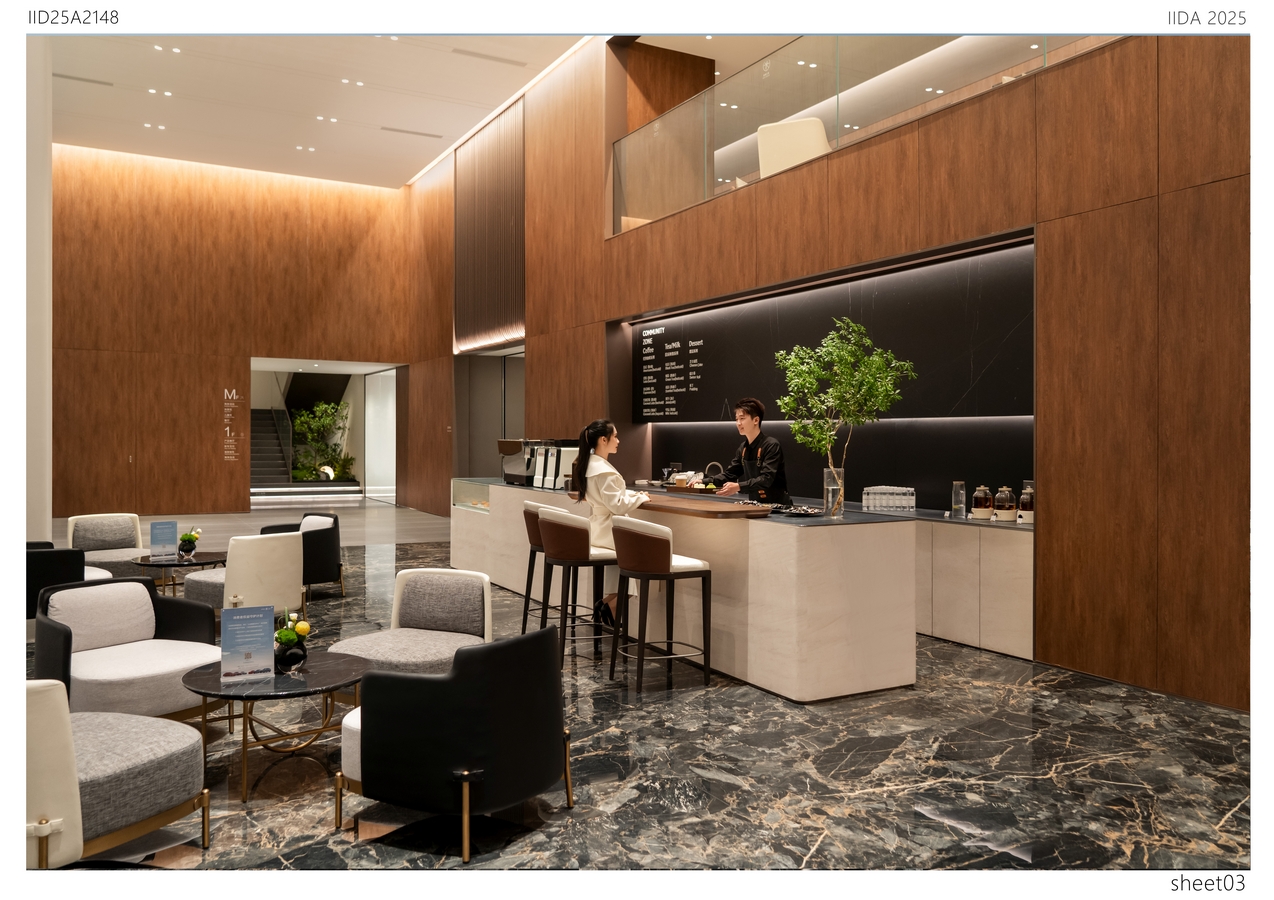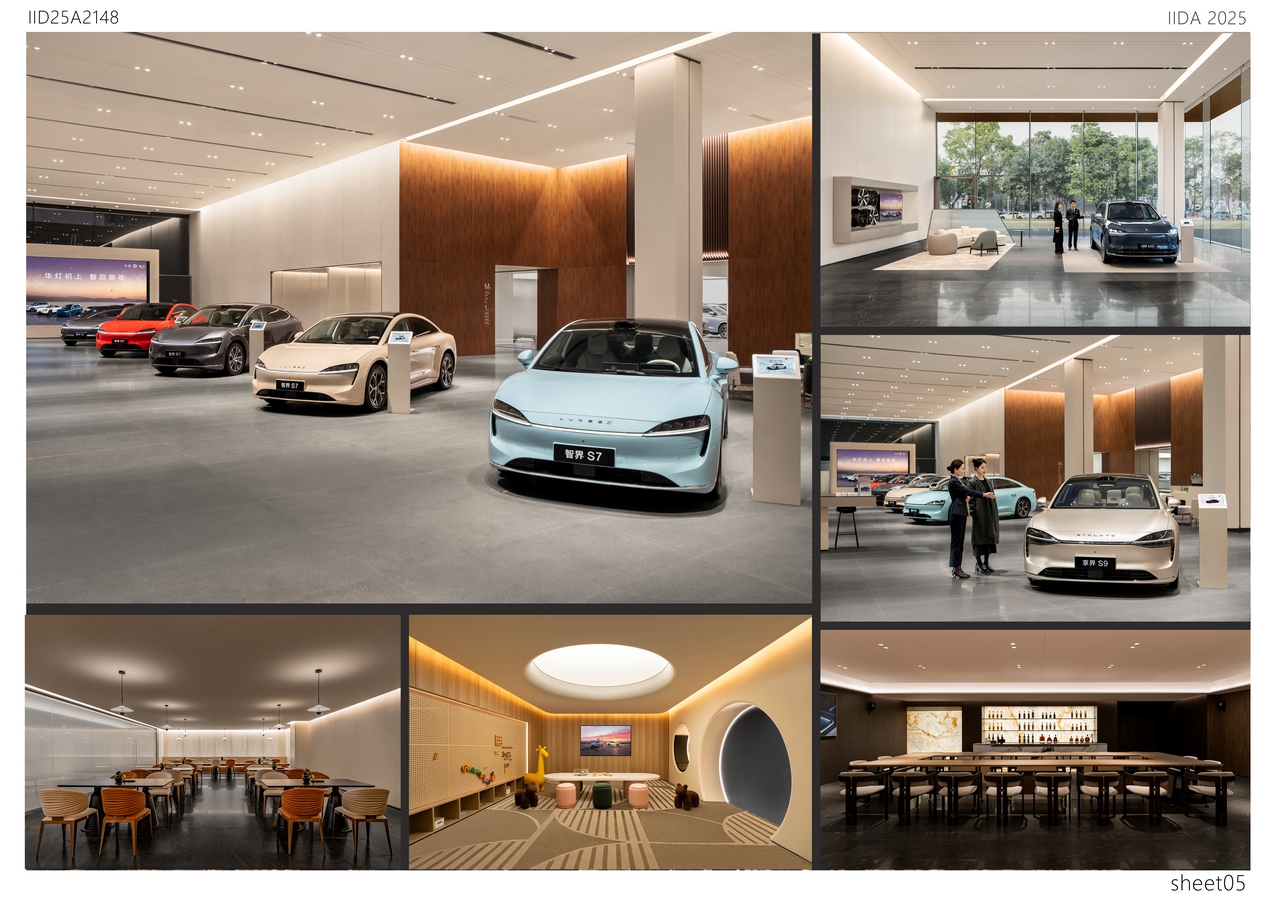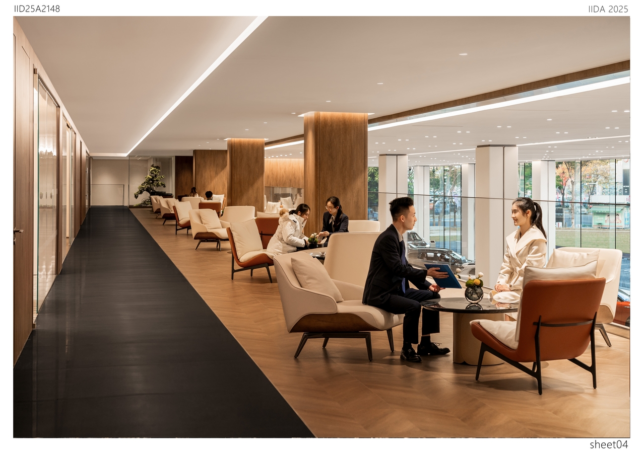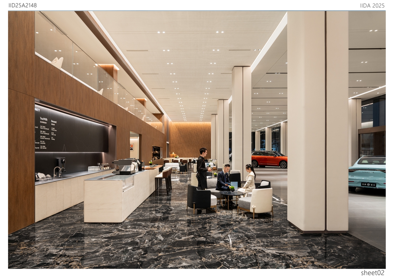 Delicate metallic lines break the monotony of traditional showrooms while providing both rain and sun protection. The column design draws inspiration from the Doric order of the Parthenon, reinterpreted through modern minimalism to express ceremonial grandeur and the beauty of structural power in a clean and pure form. At the heart of the exhibition hall lies the central vehicle display zone, where an enclosing sofa layout enhances both focus and intimacy, naturally directing attention toward the showcased vehicle. The lounge area combines materials such as solid wood, natural stone, and satin-finish paint to create a warm yet refined atmosphere. The coffee bar and counter design balance functionality and aesthetics, embodying the brand’s philosophy of harmony between technology and humanity. A mezzanine-level multifunctional salon space, equipped with high-quality audiovisual systems and flexible layouts, accommodates diverse event needs. Through the balanced interplay of proportion, material, and light, the overall design presents a futuristic environment that harmonizes rational order with emotional experience—reflecting the technological elegance and human warmth of the Harmony Intelligent Mobility brand.