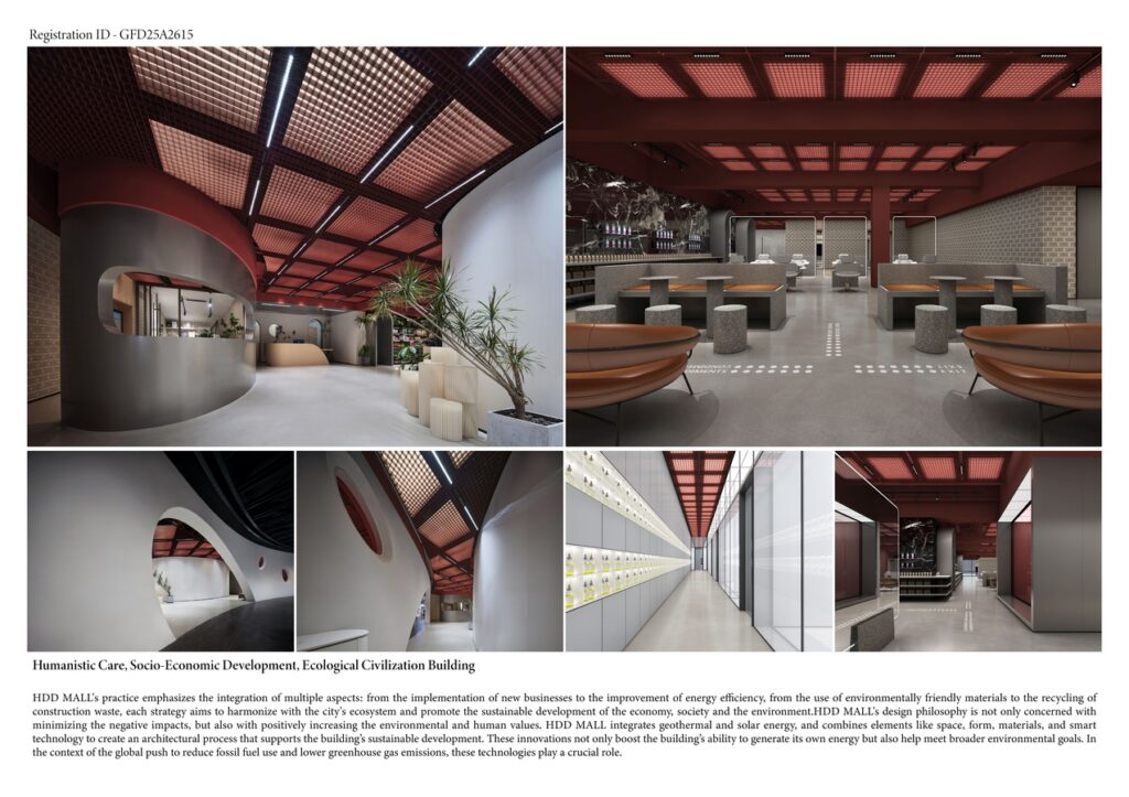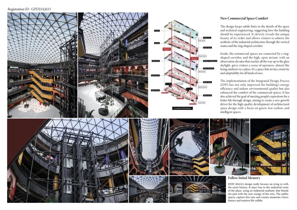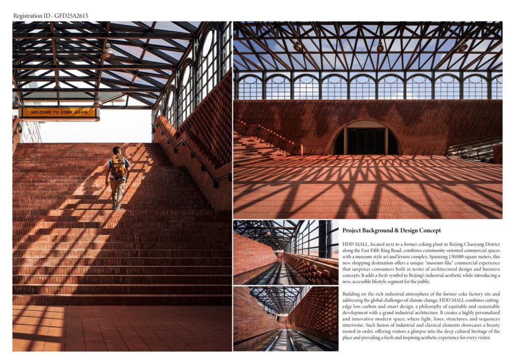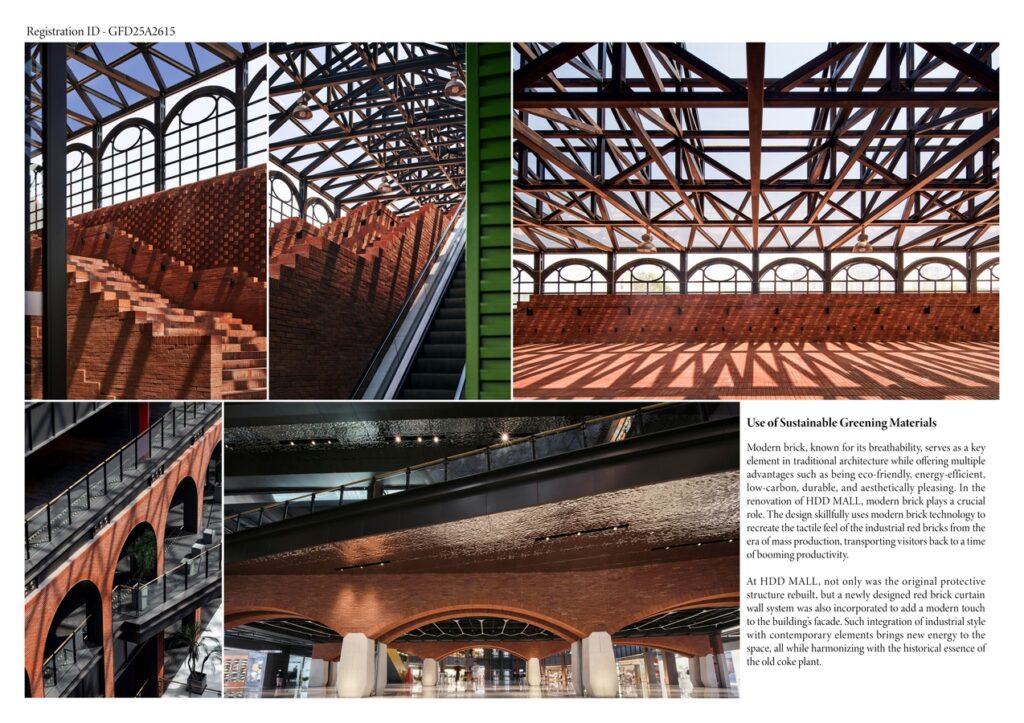 Building on the rich industrial atmosphere of the former coke factory site and addressing the global challenges of climate change, HDD MALL combines cutting-edge low-carbon and smart design, a philosophy of equitable and sustainable development with a grand industrial architecture. It creates a highly personalized and innovative modern space, where light, lines, structures, and sequences intertwine. Such fusion of industrial and classical elements showcases a beauty rooted in order, offering visitors a glimpse into the deep cultural heritage of the place and providing a fresh and inspiring aesthetic experience for every visitor. HDD MALL’s design makes a strong effort to use more sustainable materials, cutting down on carbon emissions from the extraction, processing, and transportation of building materials. A lot of the recycled materials were collected from nearby buildings. By mixing these bricks, metals, cement, and the textures of the existing structures in a thoughtful way, the design brings order to what might seem like rough, unfinished materials, and gives the building a unique and striking beauty.
