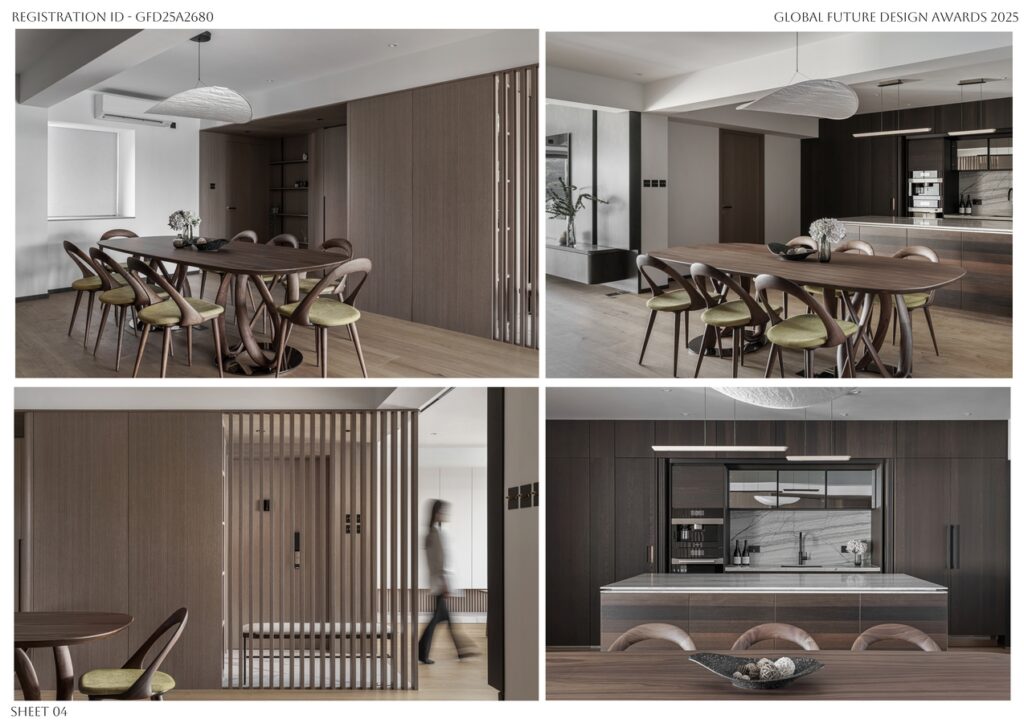 The central living area embodies the spirit of modern openness. Spatial zones—living, dining, and kitchen—are integrated into a single flowing volume, allowing for continuous movement and effortless connectivity. Bespoke storage solutions are subtly embedded into walls, ensuring clutter-free living while maintaining a clean, minimalist aesthetic. The material palette is deliberately warm and tactile: light-toned oak flooring, matte beige wall finishes, soft fabrics, and occasional accents of brushed metal and natural stone. These elements work together to evoke a sense of calm, tactility, and timelessness.