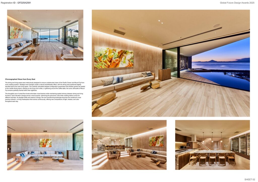 Strategic level changes between dining and living areas create a natural amphitheater effect, ensuring unobstructed views of both ocean and mountain from every seating position. Whether guests occupy the marble dining island, relax on living room sofas, or gather around coffee tables, Mount Fuji remains perfectly framed within their sightlines.